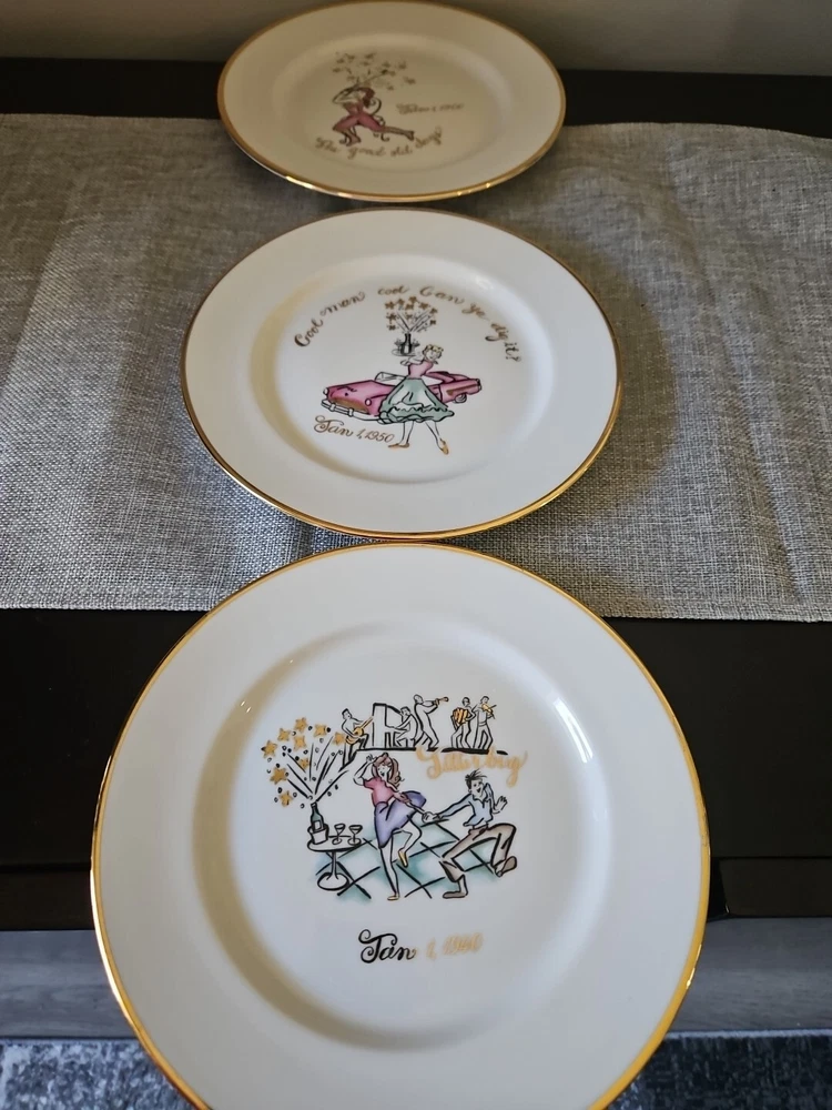 This set of three collector plates by Rosanna is a beautiful addition to any collection. The plates feature various patterns in vibrant multicolors, all on round 8-inch diameters. Made in Italy, these plates are a true representation of Italian culture and are perfect for all occasions. Whether you're displaying them in your home or using them to serve special dishes, these plates are sure to impress. Add them to your collection today! Years 1900, 1940, and 1950.