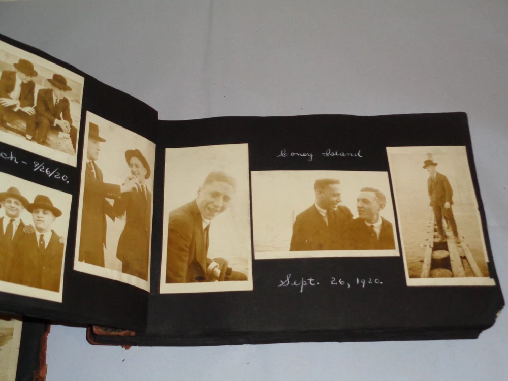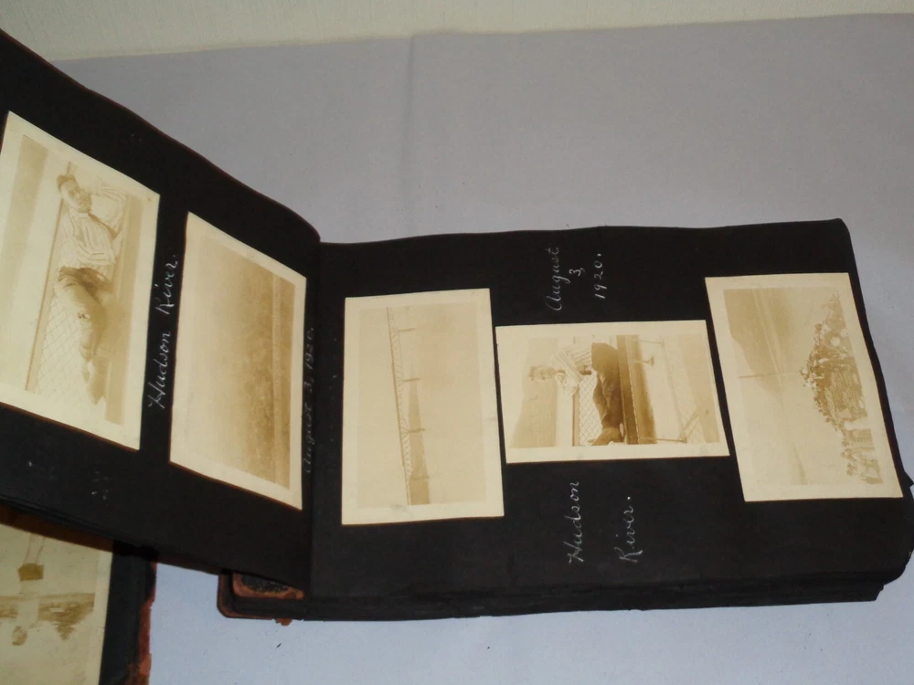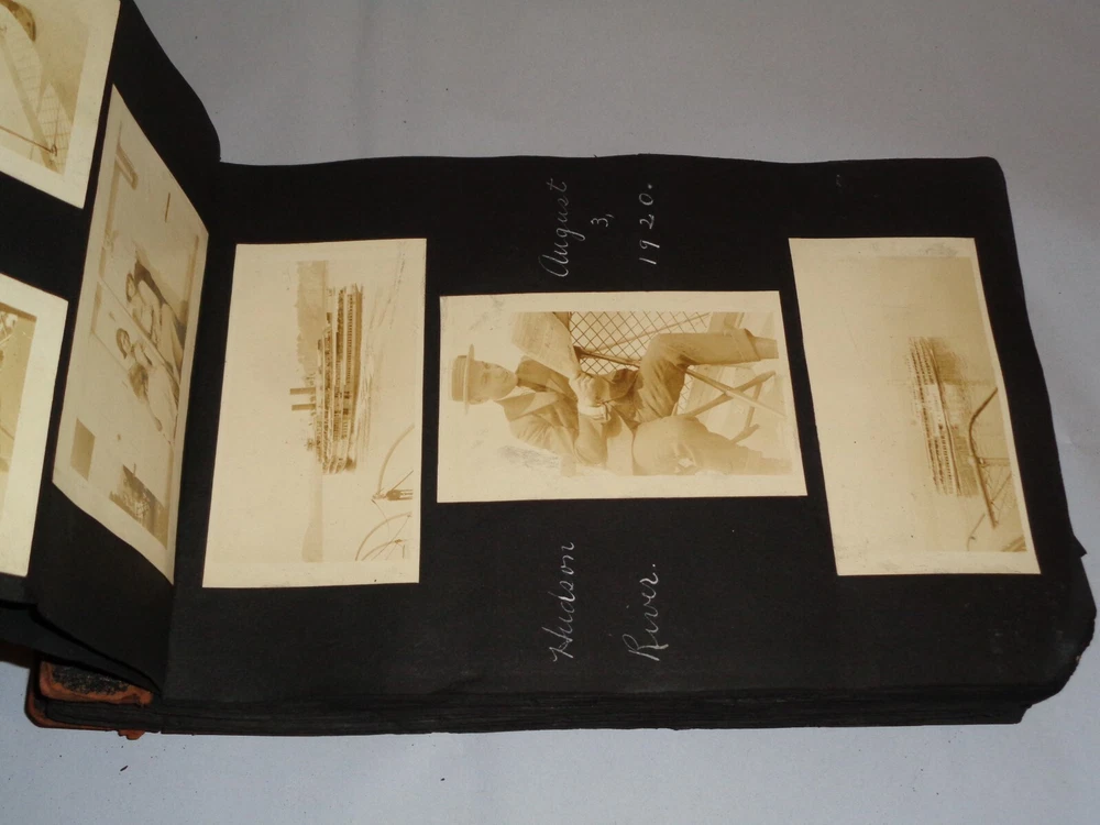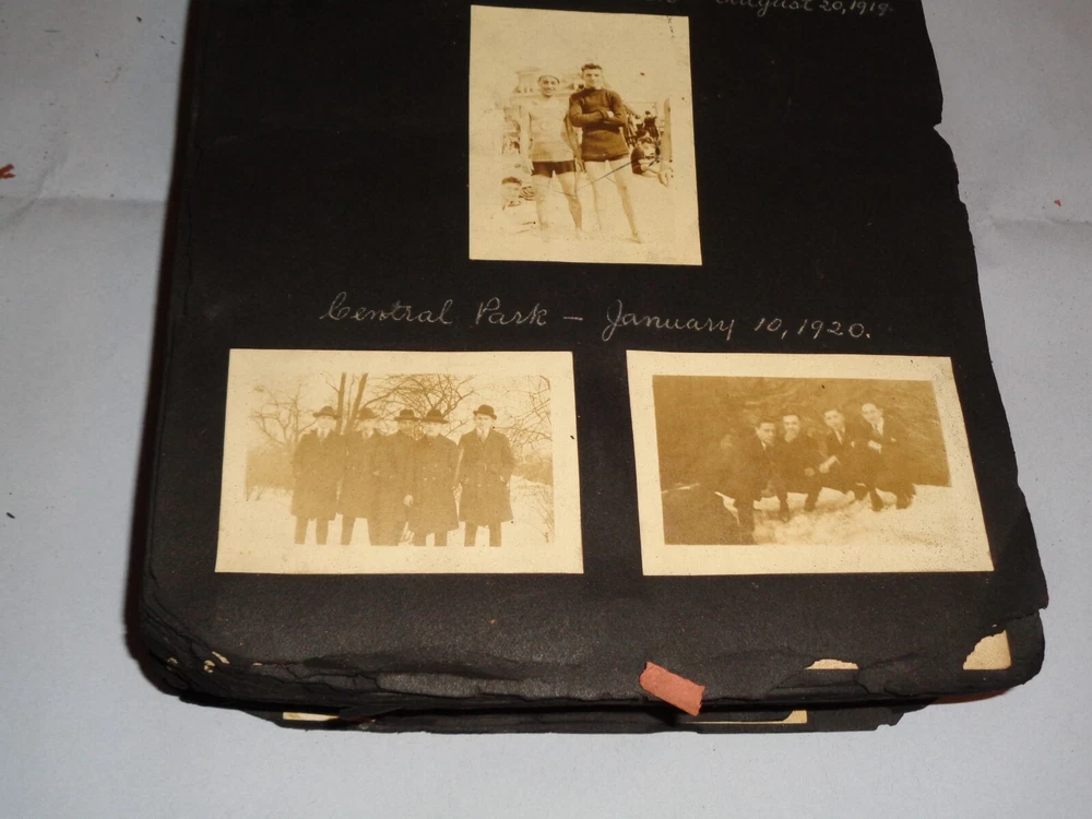 Antique Original 1920s New York City & Area Rare Photo Album - Over 400 Photos Many pages have information written on them to include the location and date. On the first page, it states that the album begins in June 1920, but photo captions indicate that the earliest is from 1918 and the latest date that I can find is 1921. Locations include Brighton Beach, Ellis Island, Brooklyn, Hudson River, Neversink, Far Rockaway, Long Beach, Coney Island, Prospect Park, Rockaway Beach, Central Park, and more. Photos are mostly of people, friends, and family at various locations mentioned above. One of the photos is of Ellis Island Commissioner Frederick Wallis. As you go through the book, you see that the caption information stops, and there is no longer dates and places written on pages. There are approximately 441 Photos altogether, give or take, and two photo negatives. The photos are affixed to the pages. There are over 125 pages. The album itself measures about 7" x 11 3/8". Photos measure from 1 7/8" x 2 7/8" (smallest) to 2 3/4" x 4 3/4" (largest). There are around 10 blank pages in the back of the album. This album is in antique condition and is extremely fragile. The front cover is loose, and there is no back cover. There are additional loose pages in both the front of the album and in the back. There is heavy cracking, discoloration and wear to the front cover. There are stray pieces of tape on the cover and on the binding, where it appears someone tried to tape the front cover on. Note that there is edge chipping, tearing, cracking, missing corners, discoloration, and other wear throughout the book. There are paperclips randomly dispersed throughout as well, and these paperclips are rusted, leaving a mark on photos it touched. Some pages are cracked around the photos, such on the page of Commissioner Frederick Wallis (see photo). There is also an old storage-type scent, which is understandable. Overall, this album needs to be handled with care and should be historically preserved. Please see photos for more information on condition and ask any questions you may have. This would be a nice addition to any collection.