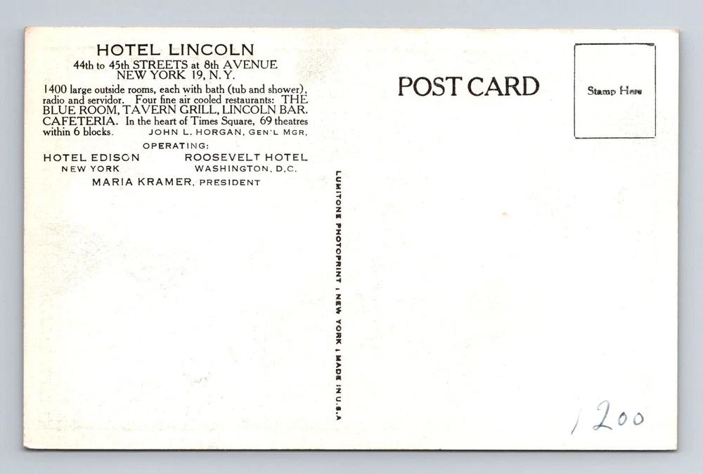 New York City, Hotel Lincoln, Advertising, Antique Souvenir Vintage Postcard