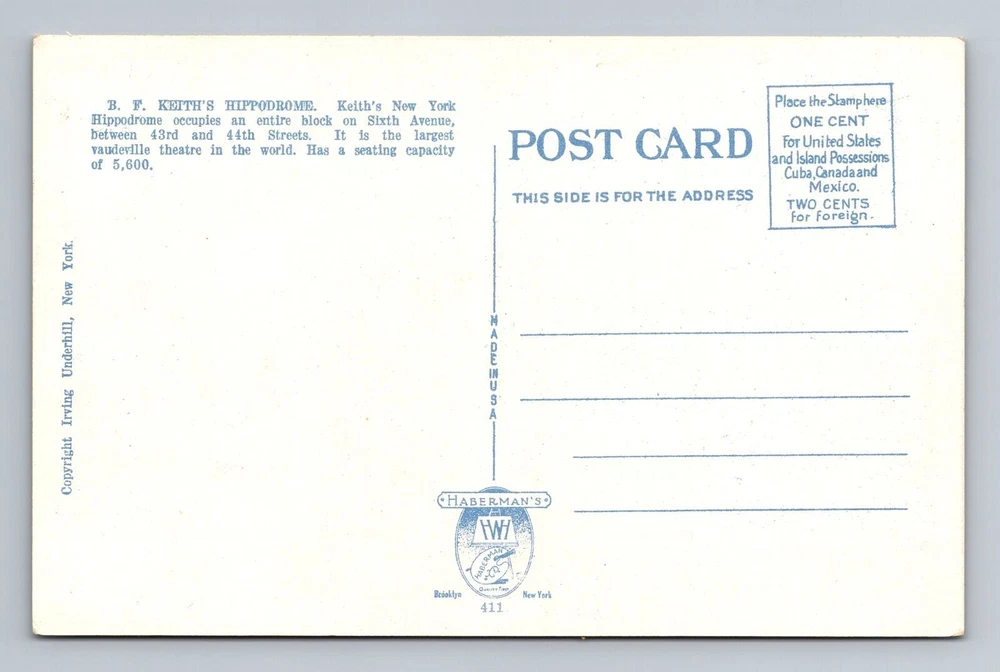 New York City NY, B F Keith's Hippodrome, Souvenir, Vintage Postcard