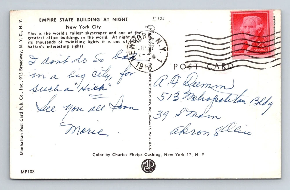 New York City NY, Empire State Building at Night, Vintage Postcard