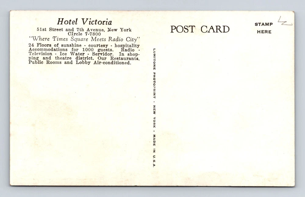 New York City NY, Hotel Victoria Advertising, Antique, Vintage Souvenir Postcard