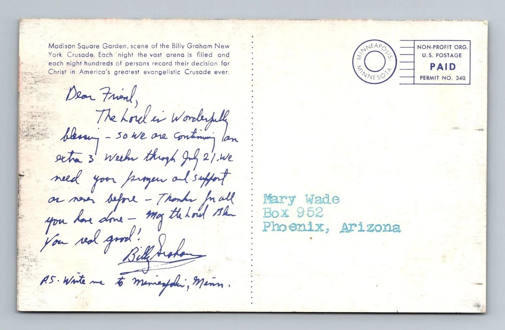 New York City NY, Madison Square Garden, Billy Graham, Vintage Postcard