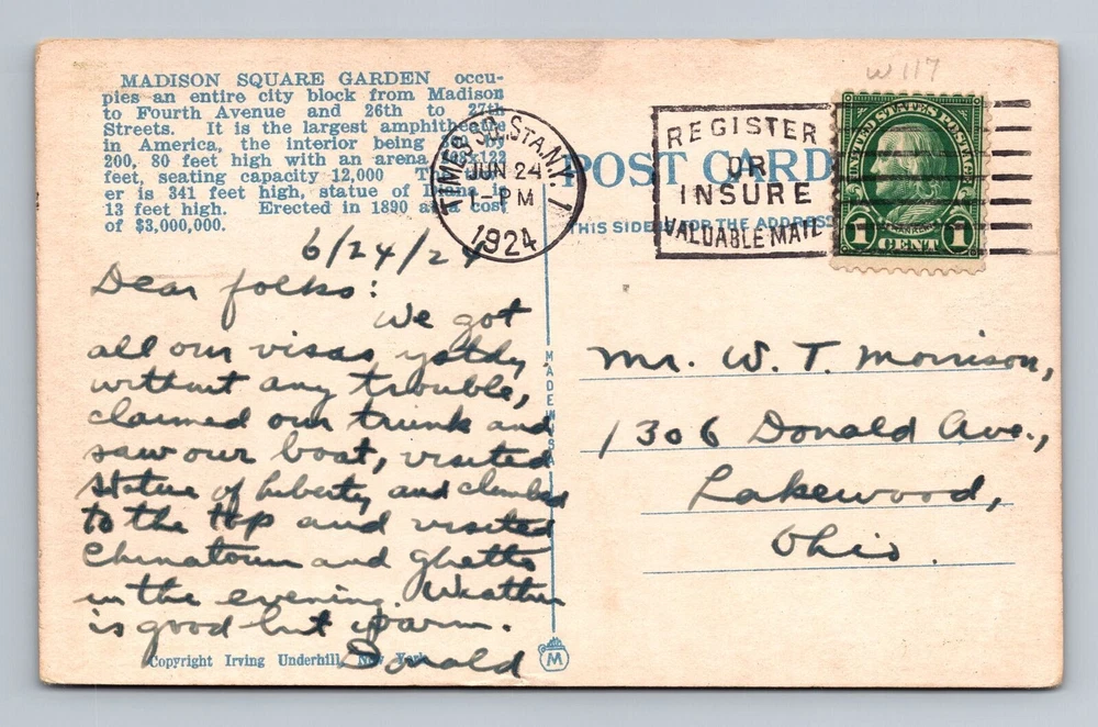 New York City NY, Madison Square Garden, Souvenir, Vintage c1924 Postcard