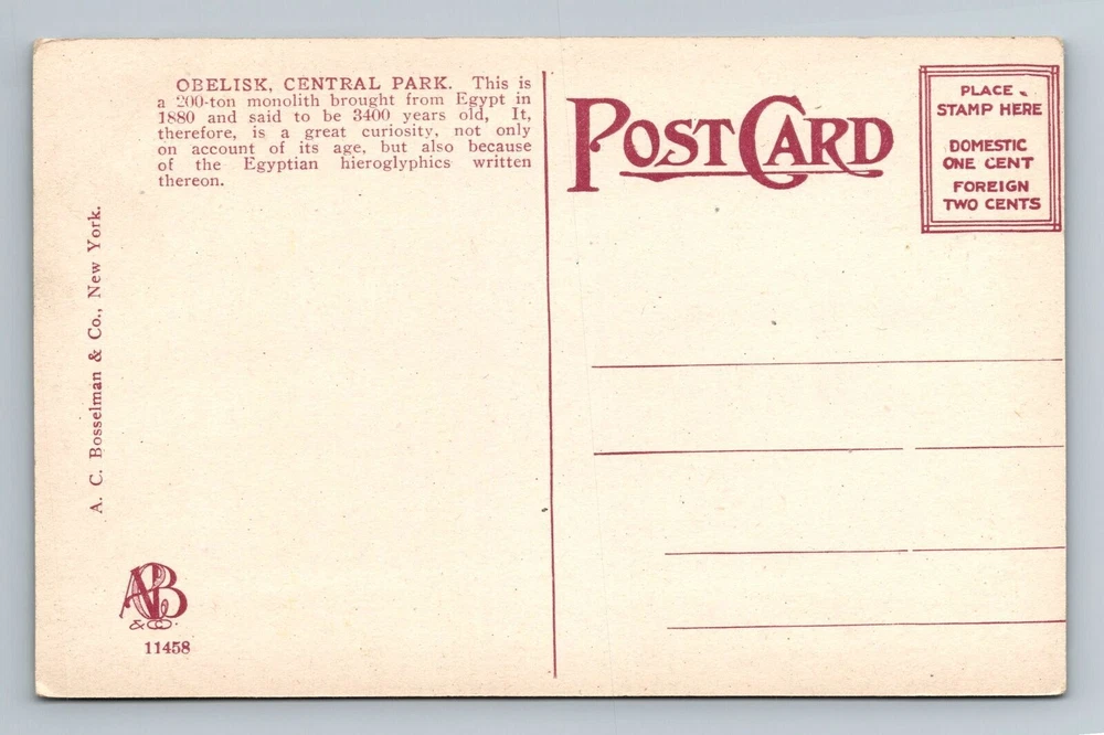 New York City NY, Obelisk, Central Park Vintage Souvenir Postcard