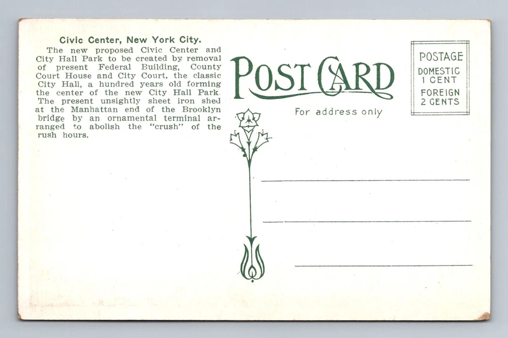 Country: USA Material: Paper Type: Printed (Lithograph) Country/Region of Manufacture: Unknown Region: New York Size: Standard (5.5 x 3.5 in) Original/Licensed Reprint: Original City: New York City Unit of Sale: Single Unit Postage Condition: Unposted Theme: Cities & Towns Era: Vintage Subject: Cities & Towns