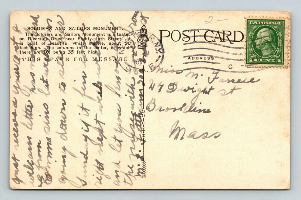 New York City NY,, Soldiers & Sailors Monument c1914 Vintage Souvenir Postcard