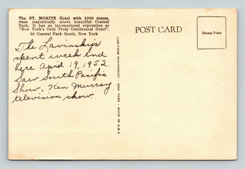 New York City NY, St Moritz Hotel, Central Park, Vintage Postcard