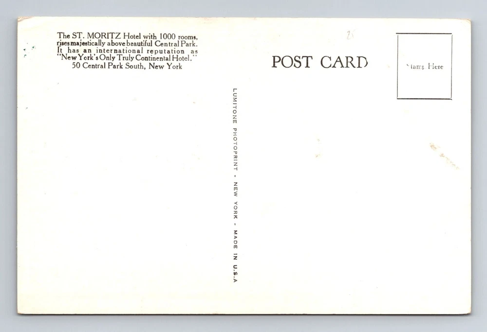 New York City NY, The St Moritz On The Park, Souvenir, Vintage Postcard