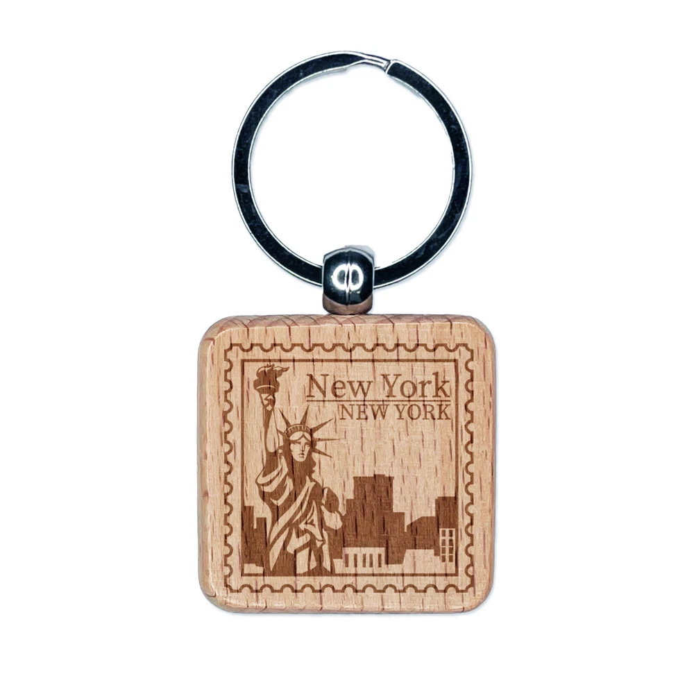 New York Destination Travel Engraved Wood Square Keychain Tag Charm