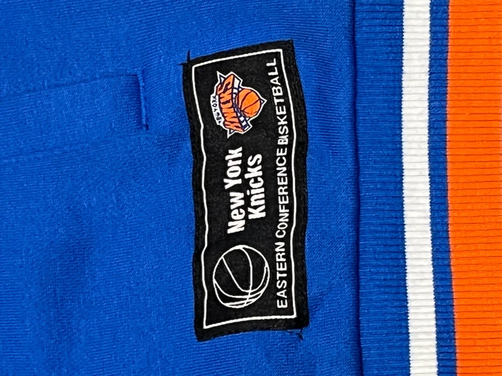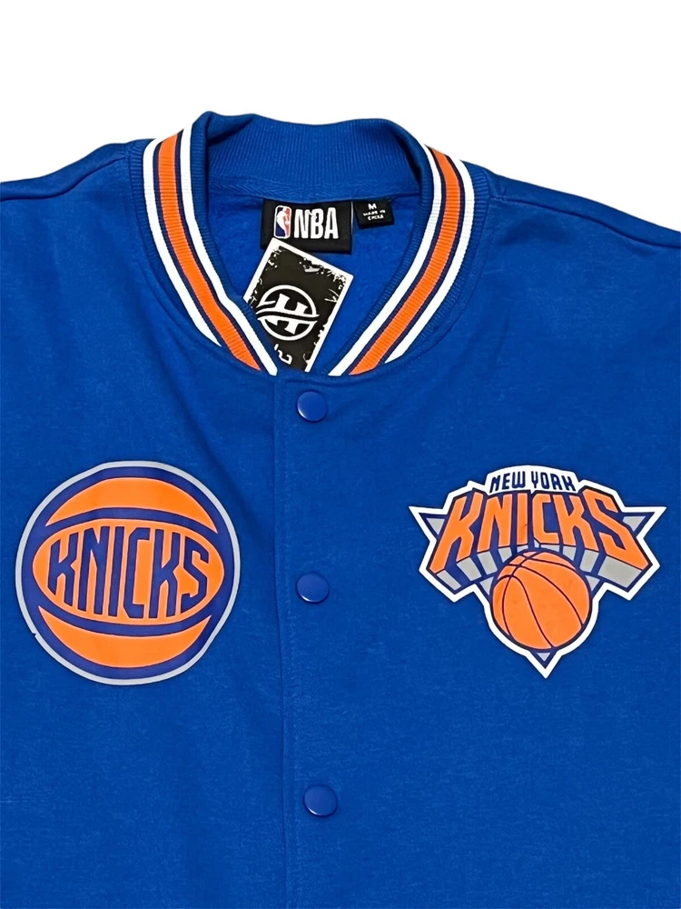 This is a NBA Team Apparel New York Knicks Jacket in size M for unisex adults. It features a multicolor animal print design, with an adjustable waist and a 22-inch inseam. Made from cotton canvas fabric, the jacket has a regular fit and ankle style. It is machine washable and suitable for winter, fall, and spring seasons. Perfect for activewear, it is ideal for gym training, golf, baseball, basketball, and football.