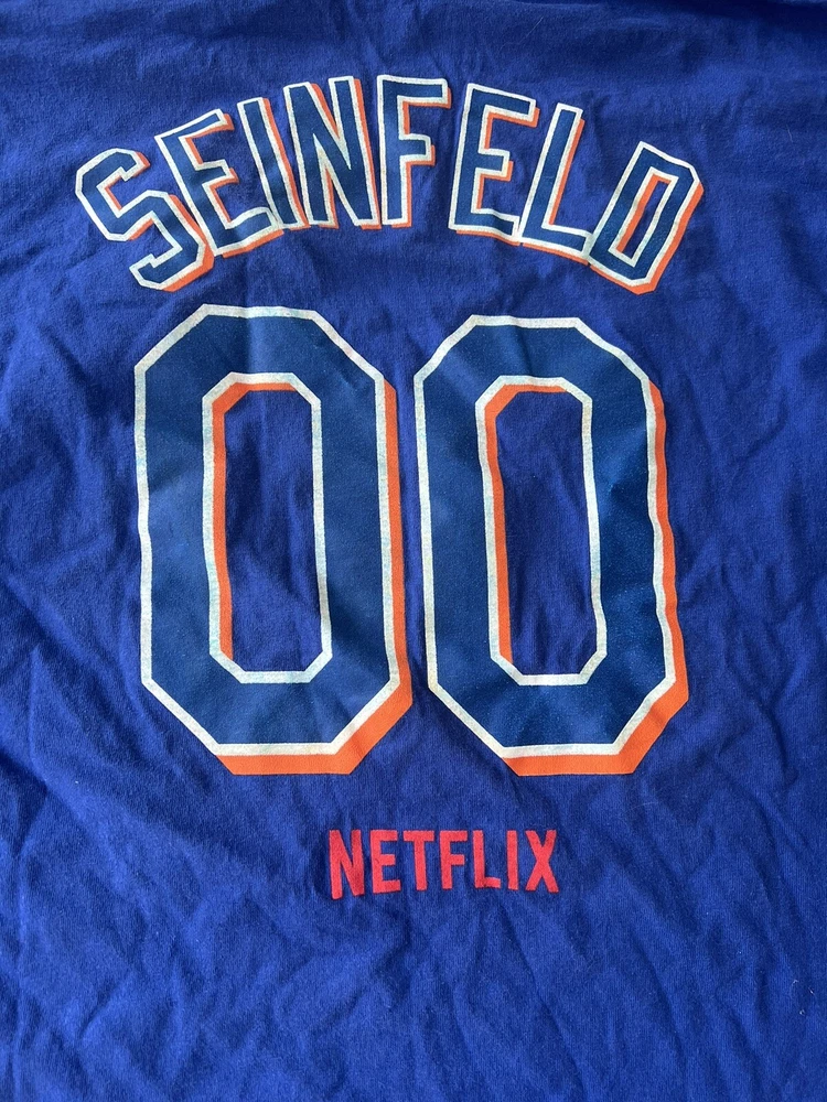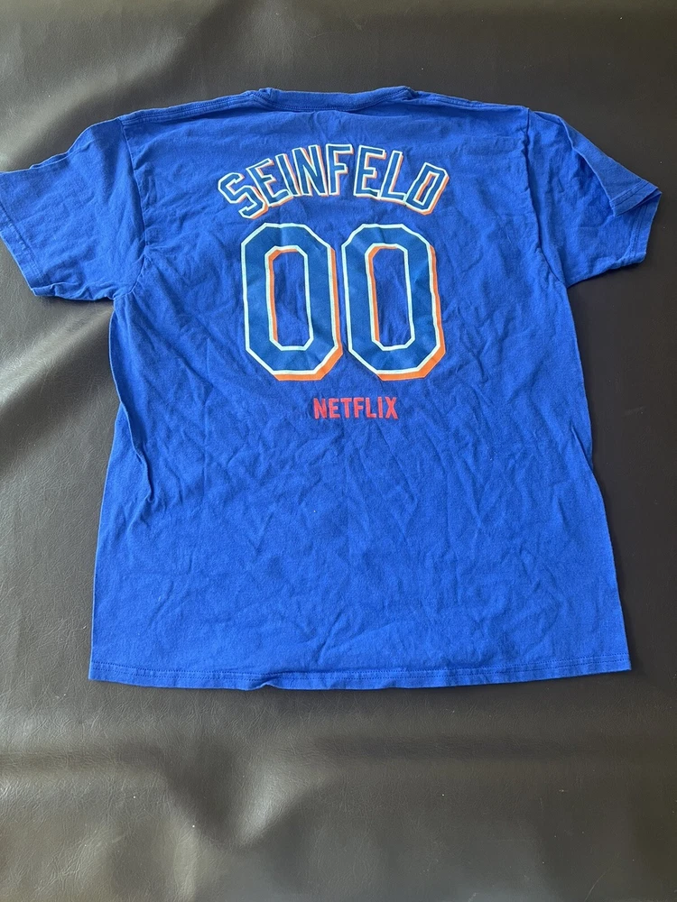 Show off your love for the New York Mets with this officially licensed Hanes baseball t-shirt. Featuring a unique design, this unisex adult shirt is perfect for any fan of the team. The shirt is made from high-quality materials and comes in a comfortable size L, making it the perfect addition to any sports memorabilia collection. Celebrate Jerry Seinfeld Night with this MLB t-shirt, perfect for any occasion. The blue shirt features the iconic New York Mets logo and is perfect for showing your support for the team during the regular season. Add this shirt to your collection today and show off your love for the New York Mets in style! Great shirt. Multiple available just in time for the season