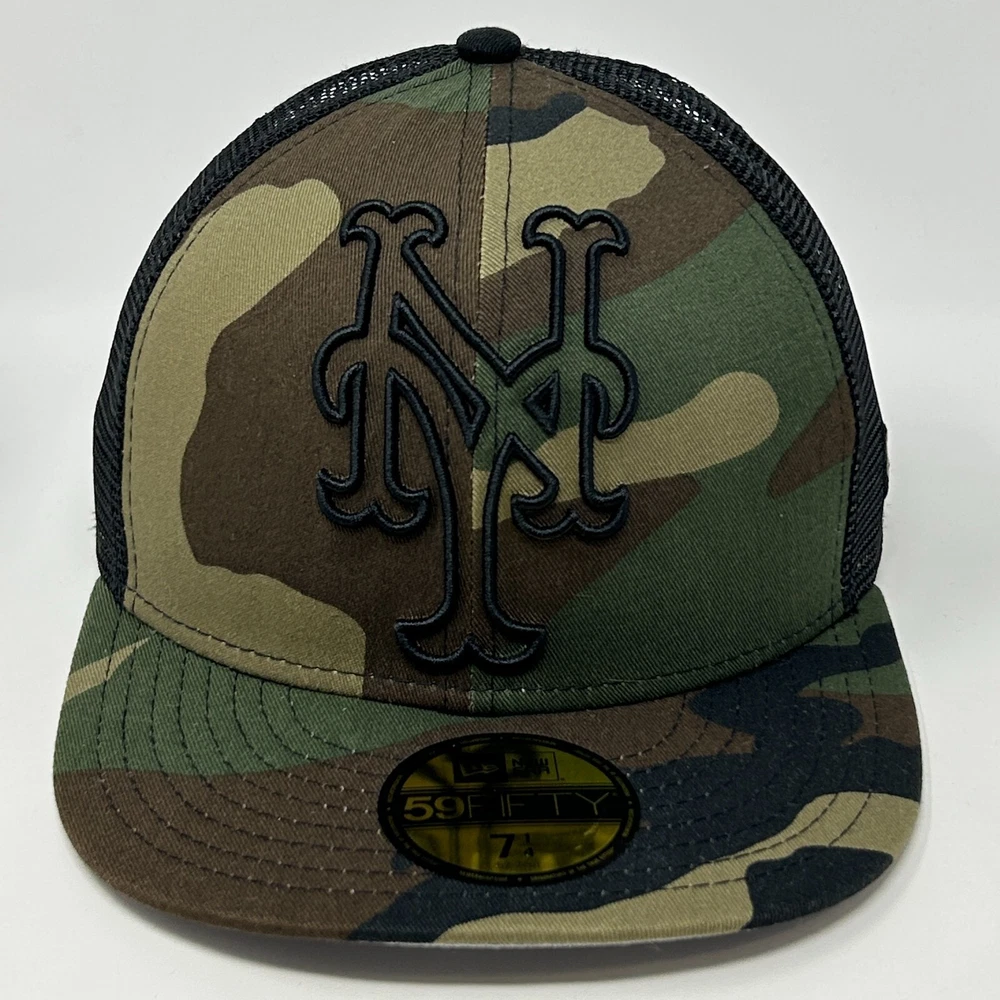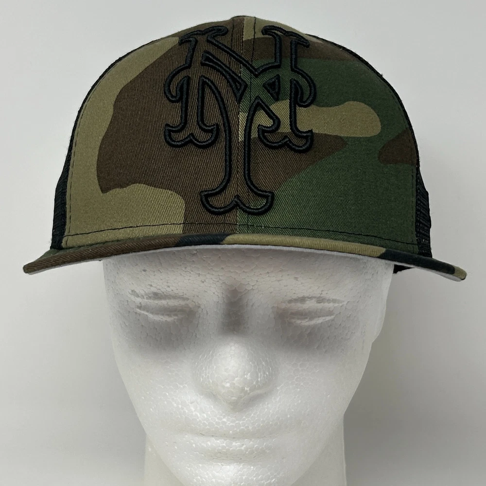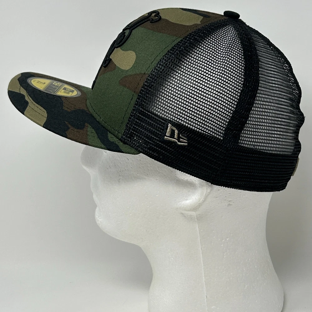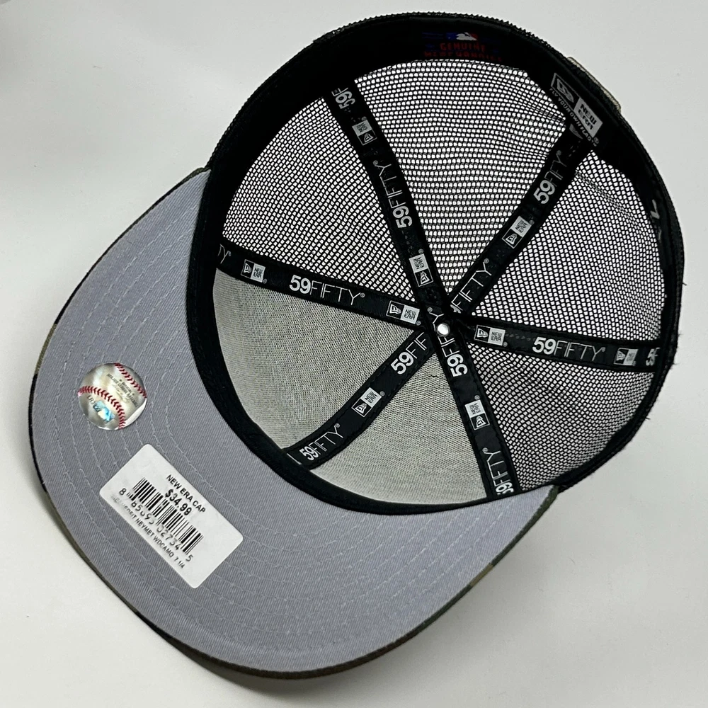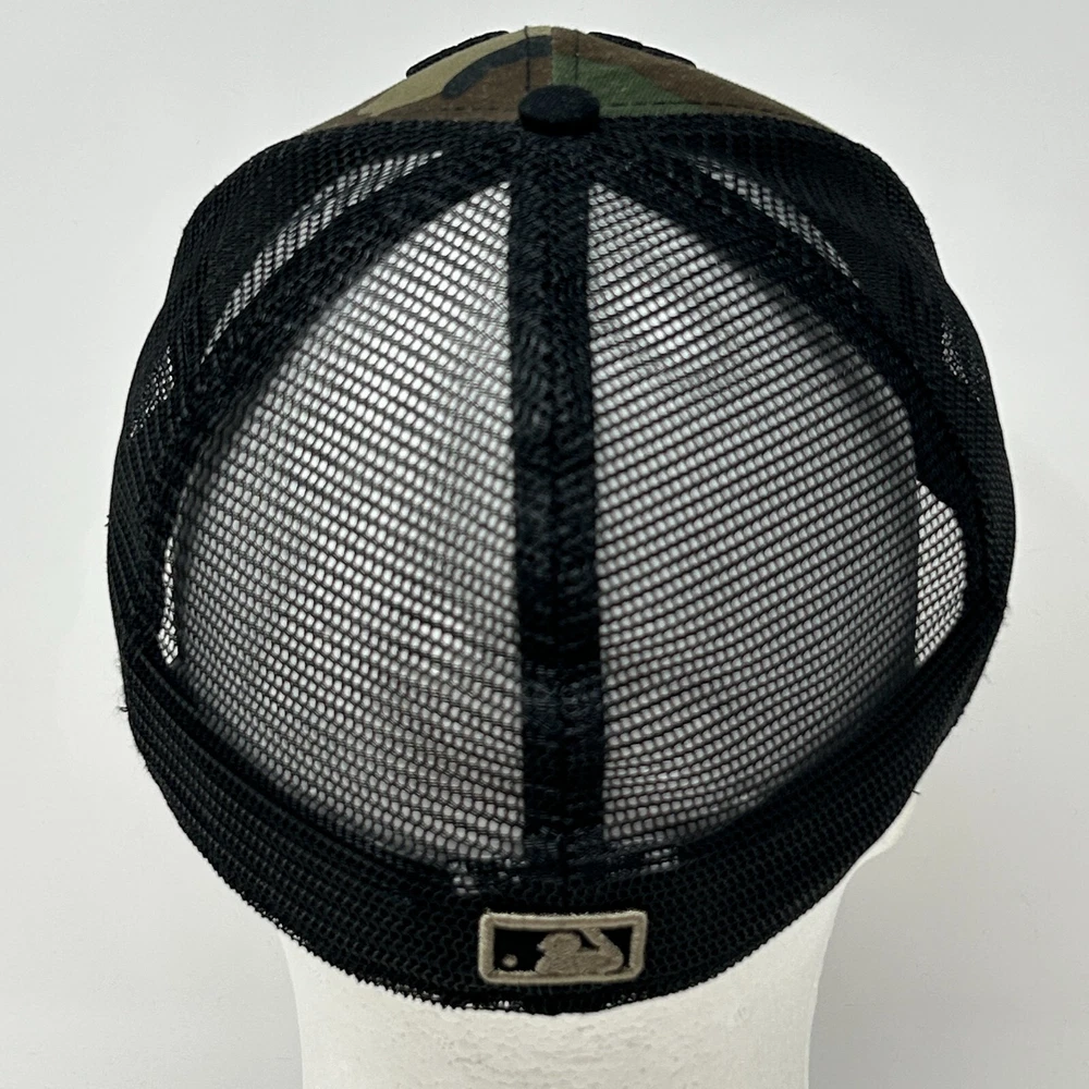 New York NY Yankees Camo Trucker Hat Baseball Cap Fitted 7 1/4 New Era 5950 59Fifty MLB Army Military Camouflage Mesh Back Six Panel Black Will be shipped in a box. CONDITION: Has minor staining on the sweatband. No other flaws noticed. Has been cleaned and sanitized. See photos.