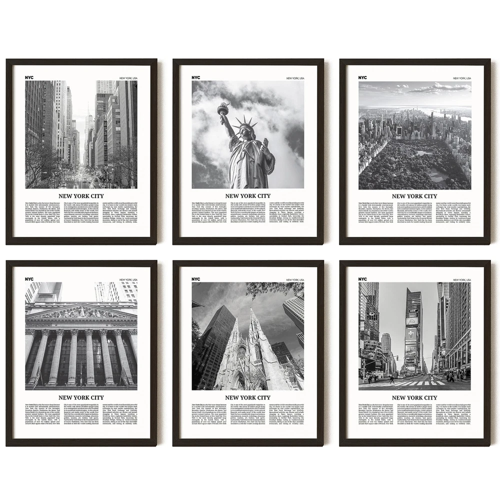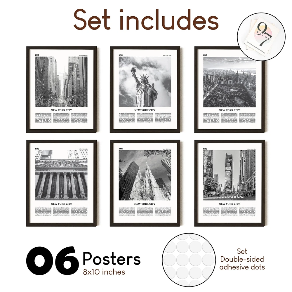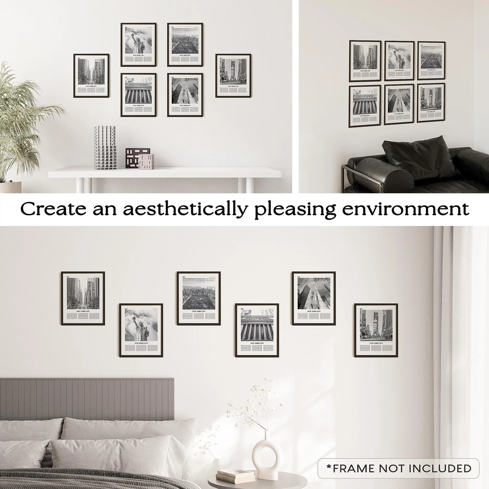 NEW YORK SKYLINE WALL ART: These New York wall art and city wall art will help your home decor to align with the magnificent view of New York city skyline art and its famous attractions BLACK AND WHITE WALL ART: Modern art New York decor, an ideal photos and pictures for NYC office decor. The combination of New York photos and NYC black and white pictures creates a perfect New York black and white poster SET INCLUDES: You'll receive 9 NYC Skyline Poster 8x10" (UNFRAMED) and plenty of glue dots to hang this PERFECT GIFTS: Landmark wall art and other New York landmarks posters are a great way to give the gift of inspiration to friends and family HIGH QUALITY NYC ART: Printed on thick cardstock papers, our NYC wall art ensures a premium feel and a long-lasting finish CAREFUL PACKAGING: These pictures are packaged in a sturdy gift box, ensuring the product's quality when delivered to you