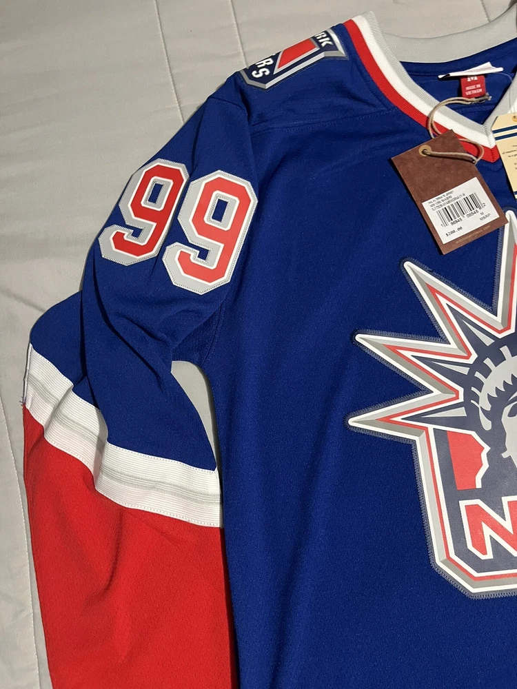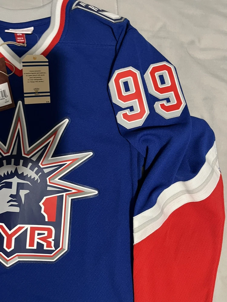 Show off your love for the New York Rangers with this Mitchell & Ness Blue Line 1996/97 jersey featuring the legendary Wayne Gretzky. The officially licensed NHL jersey is perfect for any fan looking to represent their team during the regular season. The blue color and classic design make it a stylish addition to any hockey fan's wardrobe. This men's size L jersey is made in Vietnam and has a capacity of 14 oz. It's an excellent gift for any fan of the sport or a great addition to your own collection. Get ready to cheer on the Rangers and relive the glory days of hockey with this authentic piece of fan apparel.