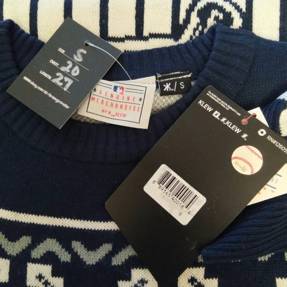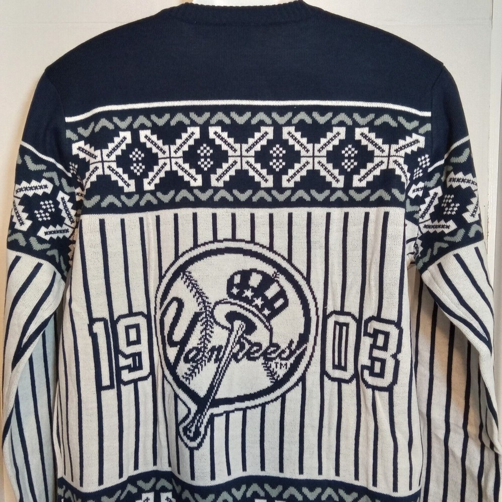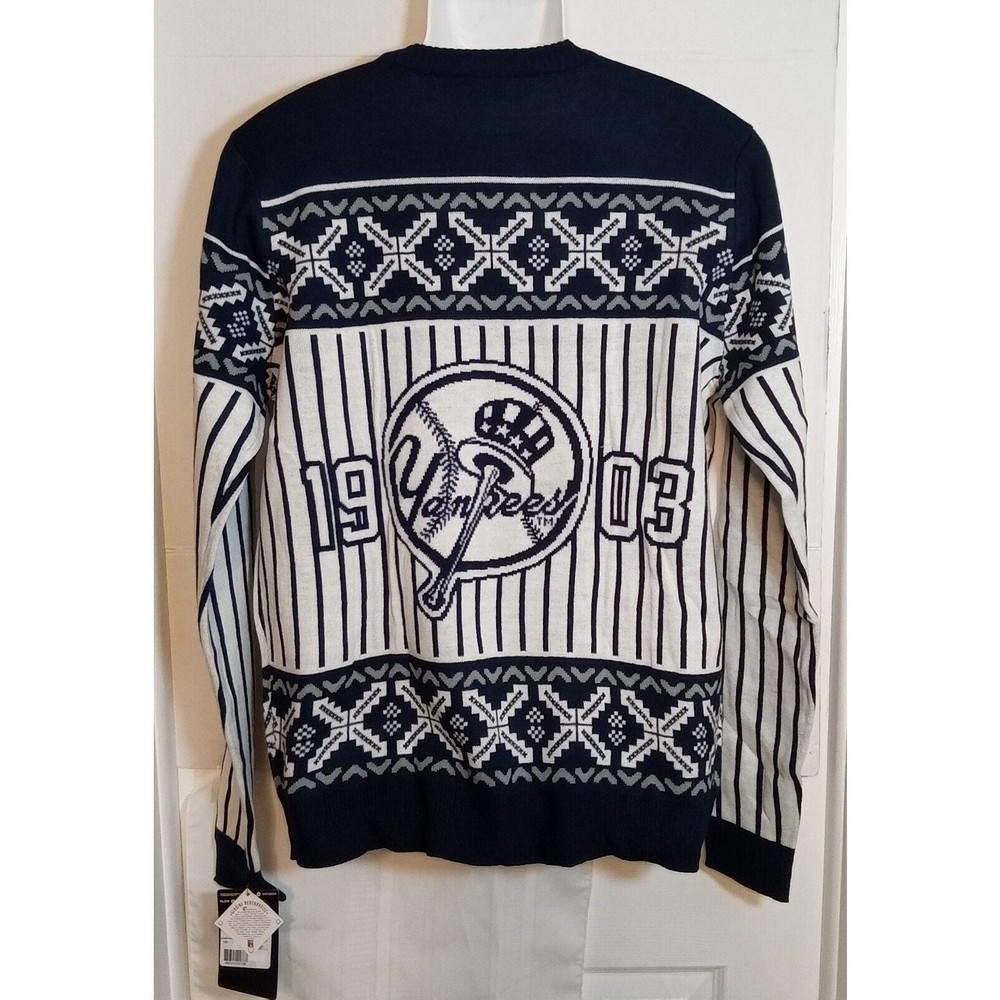 NWT. Show off your love for the New York Yankees with this official Major League Baseball men's ugly sweater. This sweater features the iconic Bronx Bombers and NY logo on the front and the 1903 with Yankees logo on the back. Made of 100% acrylic material, this sweater is perfect for keeping you warm during the cold games. The sweater is available in small in chest of 20 inches and the length of 27 inches. This product is a must-have for any true Yankees fan and is perfect for wearing to the games or out and about. G1 BOX - SMALL 1154
