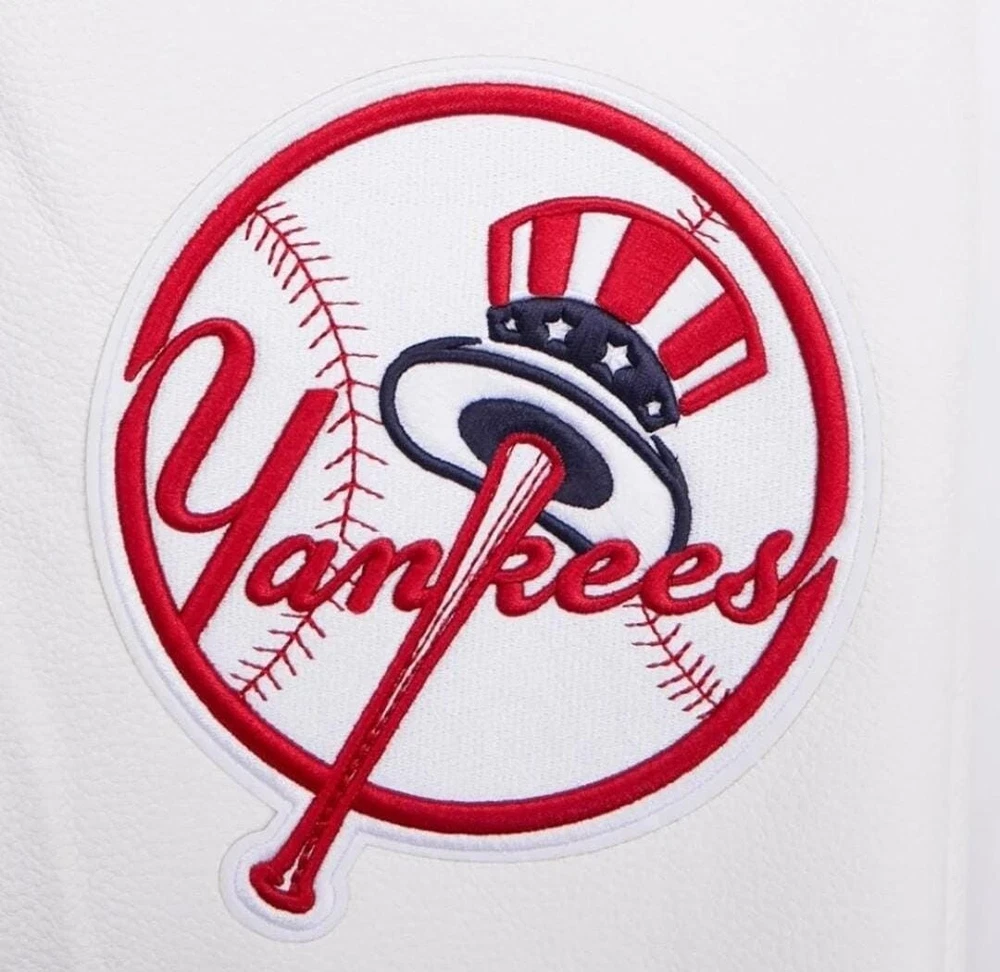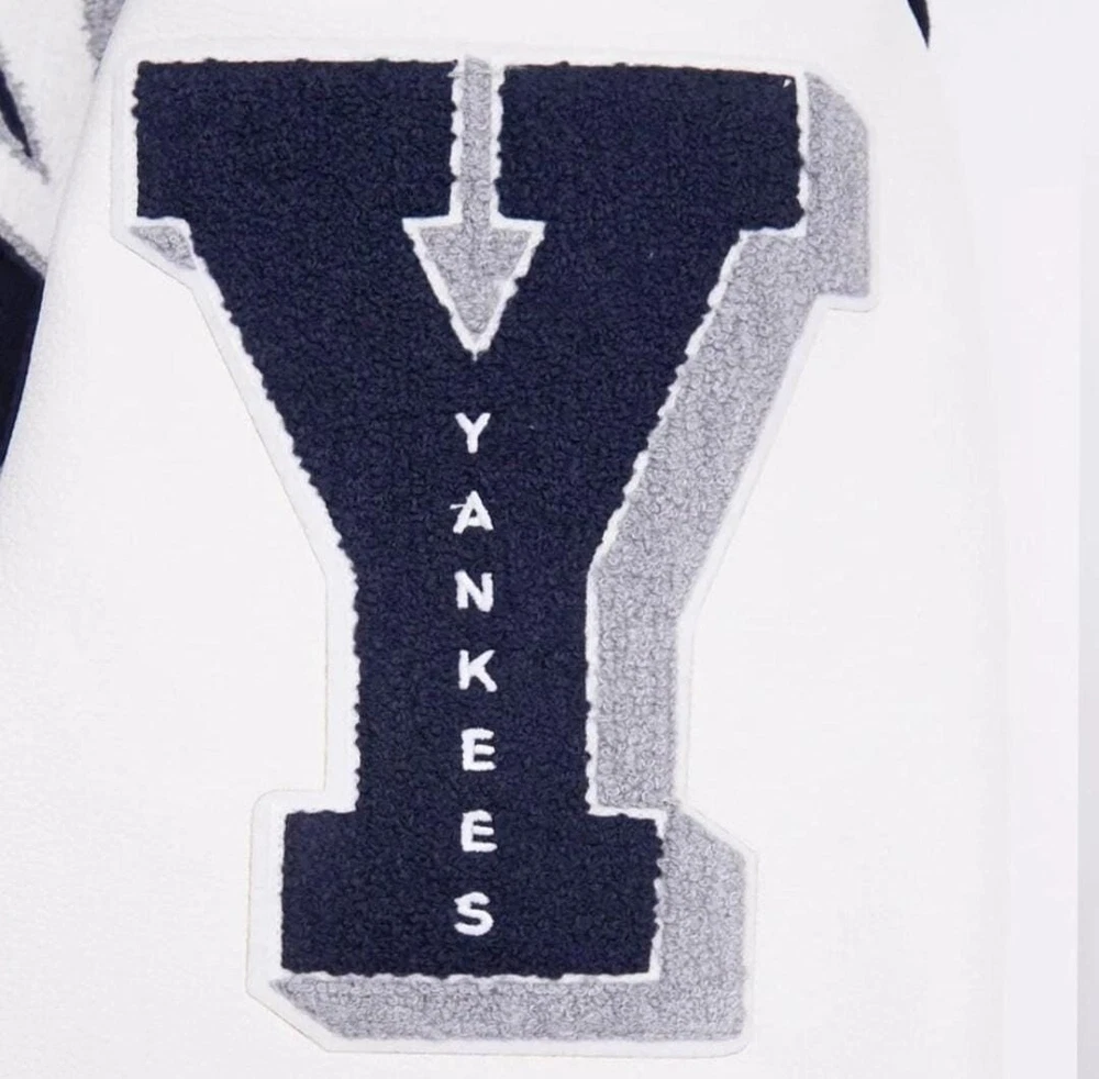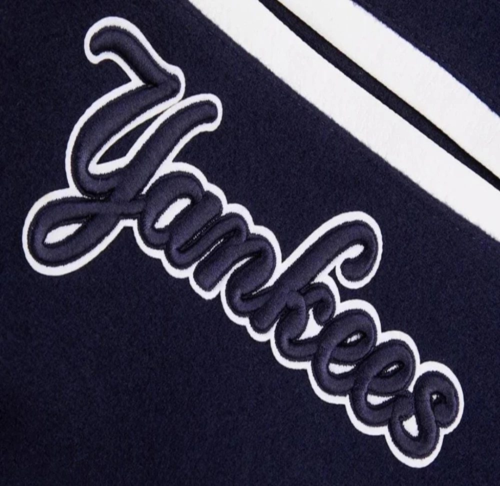 Show off your love for the New York Yankees with this stylish and unique varsity jacket. The jacket features a navy blue and white leather sleeve design with chenille embroidery that adds a touch of elegance to the overall look. It is made of high-quality wool and leather materials that ensure durability and comfort. This jacket is perfect for any baseball fan, especially those who support the New York Yankees. It is officially licensed and features the team's logo, making it a must-have for any fan. Whether you're going to a game or just want to show off your team spirit, this jacket is the perfect choice. NOTE ; Cuatom made jacket also available, send us your logo for custom jacket. Thanks