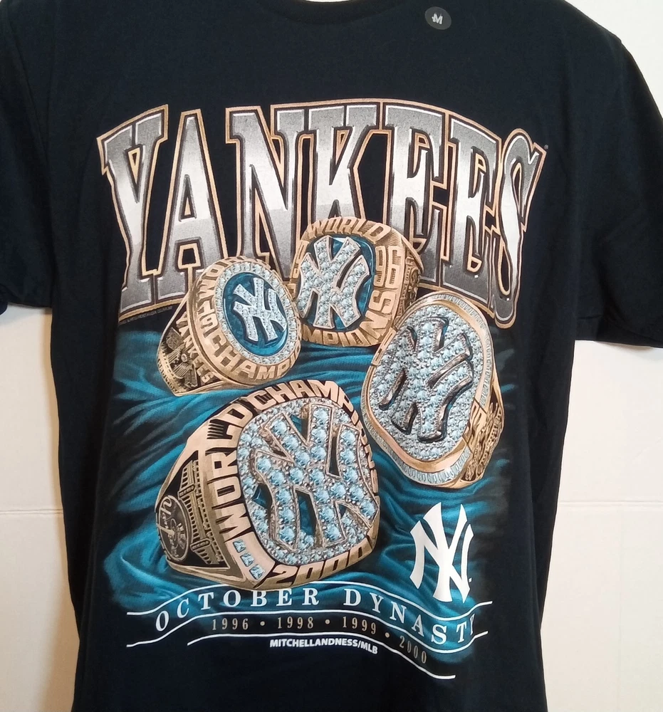 NWT. Show off your love for the New York Yankees with this Mitchell & Ness T-Shirt featuring the iconic October Dynasty. This shirt is perfect for any baseball fan and is made with high-quality materials. The shirt is designed with a chest measurement of 20 inches and a length of 30 inches, making it a comfortable fit for most people. The blue shirt is made in Mexico and features the famous Yankees logo on the front, along with the October Dynasty RINGS from 1996, 1998, 1999 and 2000. This shirt is a must-have for any collector or fan of the Yankees and is perfect for wearing to games or just around town. G14 BOX - 1285, 1286