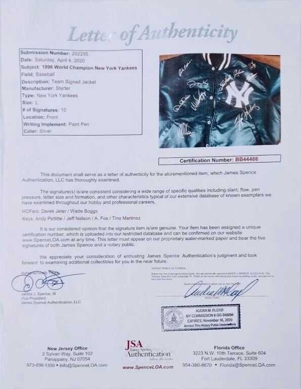 1996 World Series Champion New York Yankees team issue Starter game jacket autographed by multiple players in a silver tip felt pen. Autographs really pop in the silver color and are super clean free of any streaking or fading. Would look stunning displayed in a nice shadow box. Players autographs from the 1996 World Series Championship team include Yankee HOF legend Derek Jeter and Wade Boggs, along with notable star players Andy Pettitte, Tino Martinez, Andy Fox, Jeff Nelson, and others. This is a unique piece with very few autographed game jackets seen in the market, as well as this was the first World Series win for this Yankee team that emerged as a dynasty team. Comes with JSA authentication and COA. Don’t miss this opportunity to add this unique autographed piece of baseball history to your Bronx Bomber collection!!