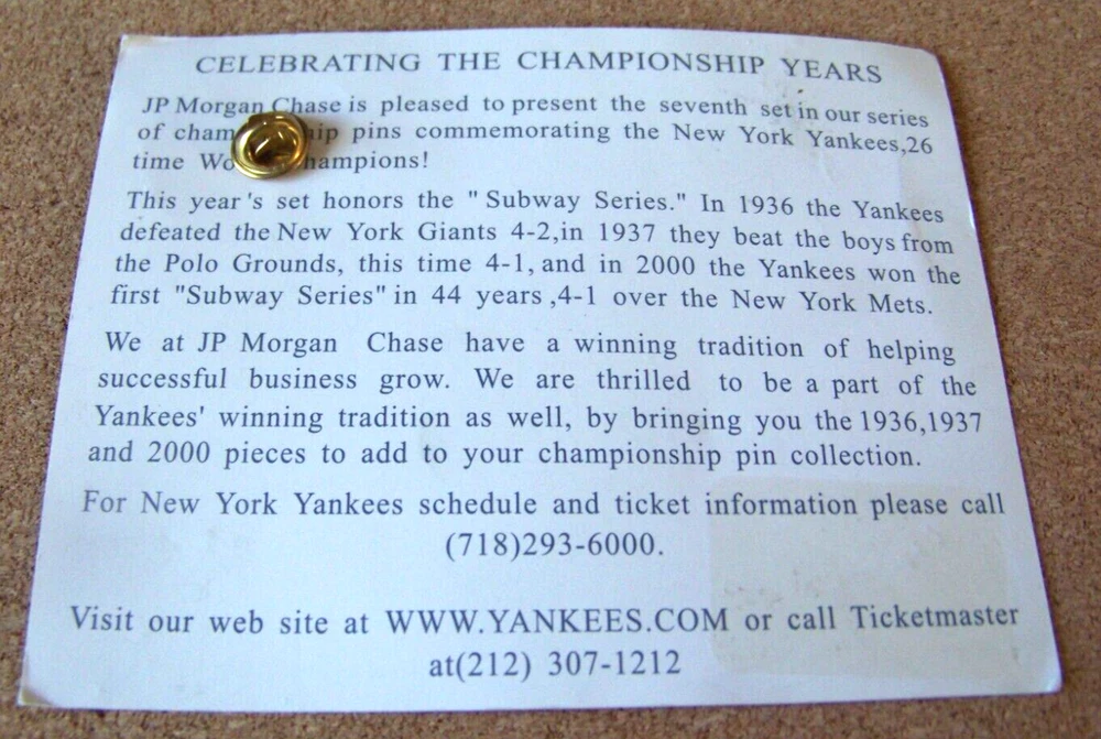New York Yankees pin 1937 World Series Chase SGA w/ backing card WS NY This MLB licensed post and butterfly clip backed pin measures about 1-1/4" wide and is rim/backed in gold tones. Part of the Chase Bank series, Yankee Stadium give away. No protective packaging, but pin is excellent, no problems. Card has minor bends and minor dings on corners. NYY, N.Y. Major League Baseball Don’t forget to click on my "Stores" link, next to my eBay name, to see other items I currently have listed for sale, or you can copy and paste this address into your browser: stores.ebay.com/highcountrycollectibles SHIPPING INFORMATION Shipping to U.S. addresses is FREE! HIGH COUNTRY COLLECTIBLES Since 1989 – A LEADER IN THE DENVER SPORTS MEMORABILIA MARKET. Check out my other auctions and listings, and keep an eye out for the different, unusual, and EXCLUSIVE items available nowhere else but from High Country Collectibles.