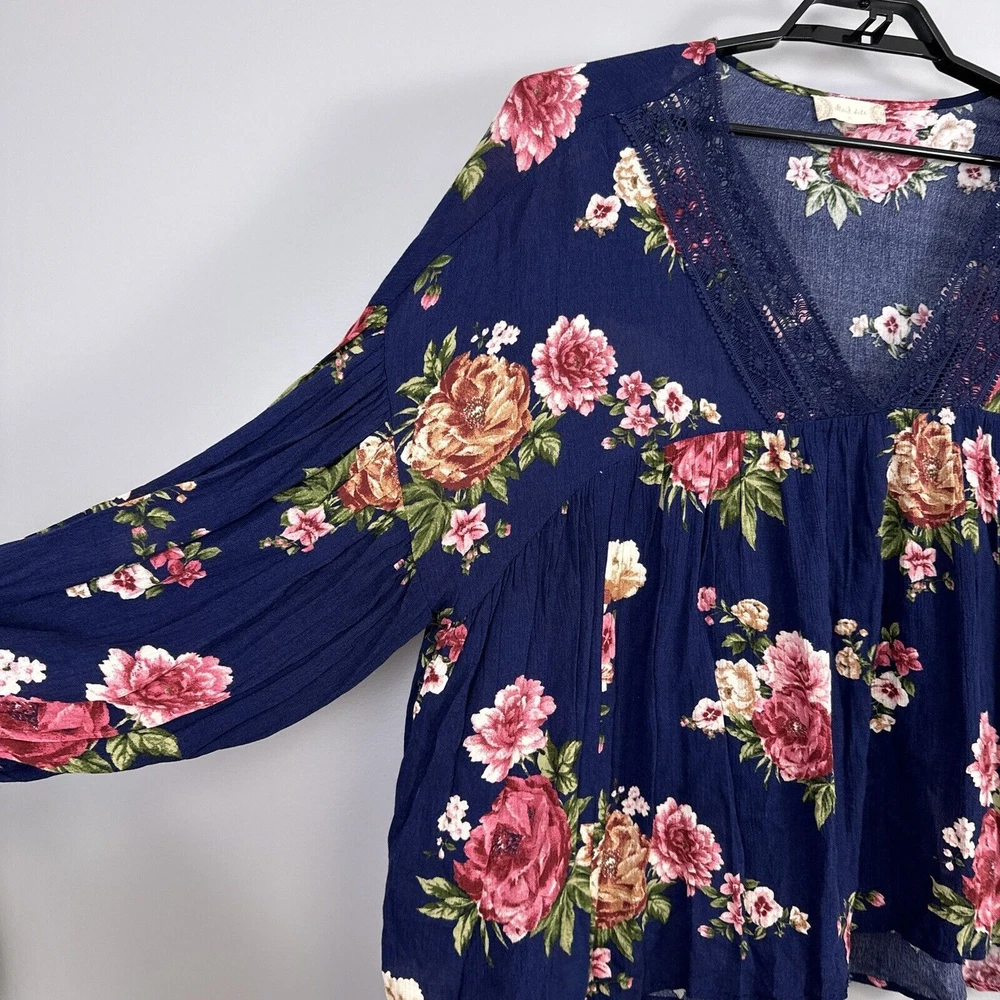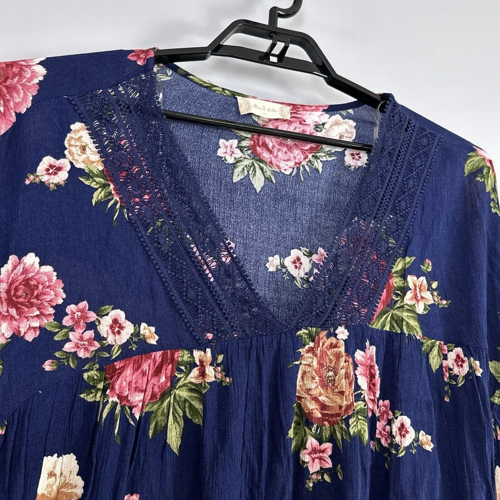 Listed is a altar'd state peasant style swing top, V-neck, babydoll style. Dark blue with floral print. 3/4 sleeve. Crochet style lace surrounding v-neck. Size: XL Fabric: 100% rayon Condition: New with tag Measurements: Lying flat, from underarm to underarm across chest: 28" across bust Lying flat, from shoulder to bottom of shirt: 24" (26" shoulder to bottom in back, slight hi-low style) Shipping cost is calculated to USPS costs based on weight of items. Thank you for looking, please message with any questions!