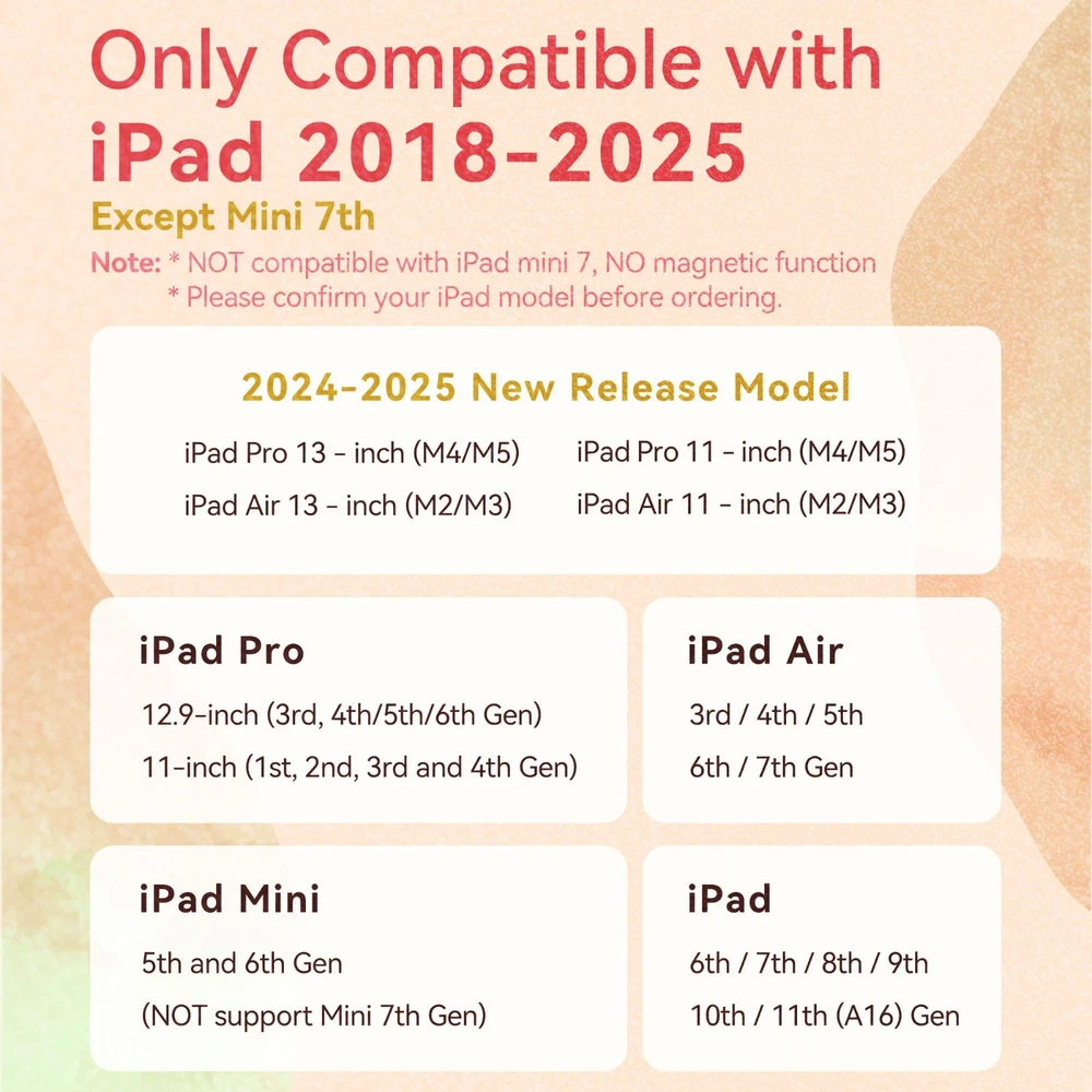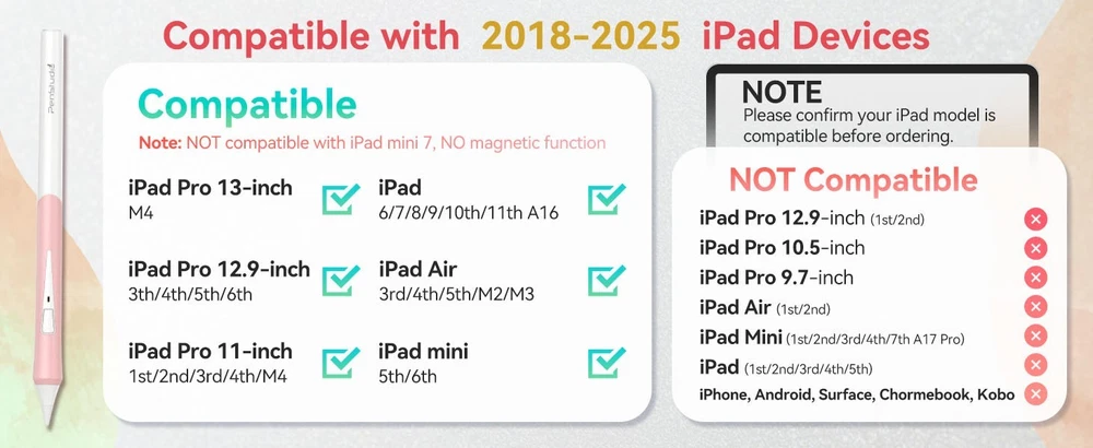 【PATENTED ERGONOMIC DESIGN】 The Penstudio PS-X iPad Pencil features a comfortable design with a 0.65°tapered shape that ensures a natural and fatigue-free drawing experience. Its soft rubber grip provides precise control and enhanced drawing accuracy, making it the perfect tool and gift. 【CUTTING-EDGE SIGNAL ADJUSTER FOR ALL TIPS】 Supported by advanced algorithms of the P2 chip, PS-X Stylus Pen for iPad delivers an exceptional 0.1mm pixel precision without any perceptible delay, guaranteeing accuracy and responsiveness across a wide range of tip options. You can swap between soft, basic and metal tips to customize your iPad drawing/writing experience while maintaining the precision and performance of the Penstudio PS-X iPad Pen. ❗❗ NOTE: Recommend tips that work with pencil 1st/2nd gen. They are compatible with Penstudio PS-X too. 【CUSTOMIZABLE SIDE BUTTON】 Penstudio PS-X iPad Stylus‘s programmable button can be customized using the intuitive Penstudio App. You can assign personalized functions to the side button with single/double/triple presses, such as changing tool from highlighter to lasso, activating an eraser, or starting recording when in your lecture or accessing frequently used tools. PS-X iPad Stylus streamlines your creative process and boosts productivity! ❗❗ NOTE: Only available in General, and 4 Apps: Goodnotes, Notability, Paint and Procreate. 【PALM REJECTION & FIND PENCIL FOR SEAMLESS USE】 With palm rejection technology, you can write and draw without worrying about accidental screen touches, enhancing your overall user experience. ❗❗ NOTE: Wireless Charging is NOT Supported. NO Magnet Attach for iPad Pro M4, iPad Air M2, iPad Air 3rd Gen, iPad 6th/7th/8th/9th/10th Gen, iPad mini 5th. 【2X FASTER CHARGE & INSTANT BATTERY INDICATOR】 Penstudio's leading fast charge tech, and longer battery life is not a blast. With just 30 minutes of charging, you get 8 hours of battery life. Charge 4 mins = work 100 mins. This triumphs over most ipad pen brands. With an instant battery % widget on your iPad, you can focus on your work or studies without worrying about running low on battery. 【COMPATIBILITY CHECK FOR 2018-2025 IPAD】 Please confirm your iPad's compatibility before purchase! Penstudio iPad Pencil PS-X specialized for NEW! 2024 iPad Air 11-inch & 13-inch (M4), iPad Pro 11-inch (M4), iPad Pro 13-inch (M4), Apple iPad (11th, 10th. 9th, 8th, 7th, 6th generation); iPad Air (7th, 6th, 5th, 3rd, 4th Gen); iPad Pro 12.9" (6th, 5th, 4th, 3rd Gen); iPad Pro 11" (5th, 4th, 3rd, 2nd & 1st Gen); iPad mini (6th and 5th Gen). Method: Settings > Tap General > Tap About > Model name [iPad XX (X generation)].