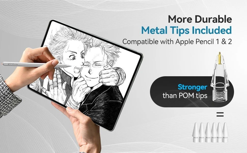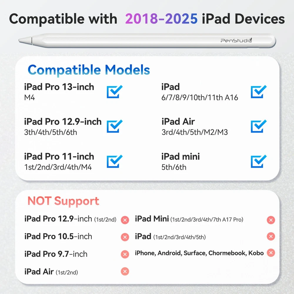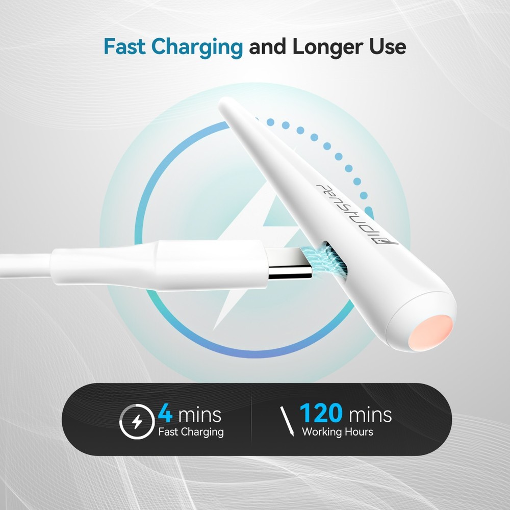 【Custom Shortcuts with Anti-Misclick Design】 Programmable side button supports double- and triple-click shortcuts like switch tool or close app. Single click is intentionally disabled to prevent misclicks. Customize via Penstudio App (Wellnote). 【Wide iPad Compatibility (2018–2025)】 Works for NEW! 2025 iPad Air 11-inch & 13-inch (M4), iPad Pro 13-inch (M4/M5),Apple iPad (11th, 10th. 9th, 8th, 7th, 6th generation); iPad Air (7th, 6th, 5th,4th,3rd Gen); iPad Pro 12.9" (6th, 5th, 4th, 3rd Gen); iPad Pro 11" (5th, 4th, 3rd, 2nd & 1st Gen, M4 / M5);iPad mini (6th and 5th Gen).Method: Settings > Tap General > Tap About > Model name [iPad XX (X generation)]. 【2X Faster Charging + Long Battery Life 】USB-C quick charge delivers 2 hours of use in 4 minutes, or 10 hours from a 30-minute charge. Stay informed with Bluetooth battery widget—no more sudden shutdowns. 【 0.1mm Pixel Precision & Tilt Support 】Experience near-zero latency and ultra-responsive control. Perfect for note-taking, sketching, or detailed design with tilt shading and smooth line flow. (No pressure-sensitive design) 【 Palm Rejection & Magnetic Attachment 】Rest your hand naturally while writing—Magnetic attachment available for specific iPad models—check device specs for support. 【 Interchangeable Durable Tips 】Includes premium metal tip and supports Apple Pencil tip replacements. Choose from soft, basic, or metal tips to match your writing or drawing style.