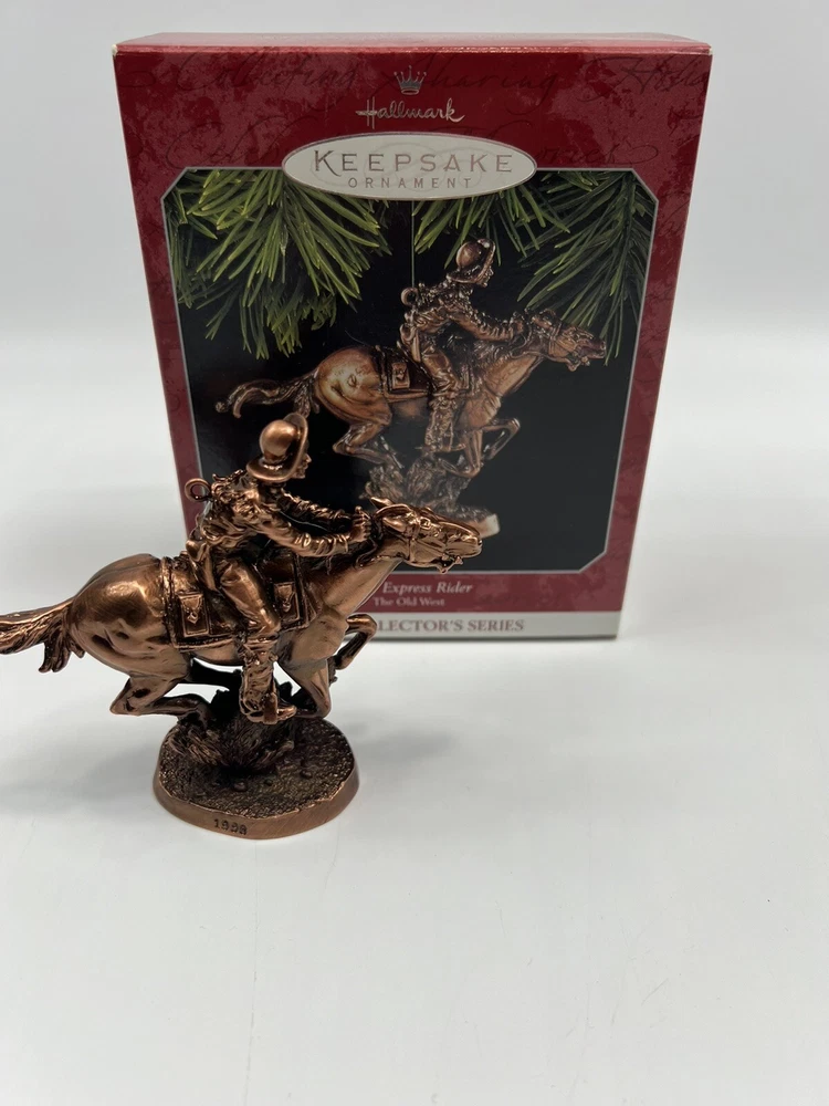 Year Manufactured:1998Shape:Cowboy On HorsebackProduction Technique:UnknownSubject:Pony ExpressCharacter:N/ASet Includes:OrnamentFeatures:HangingType:OrnamentMPN:QX6323Theme:ChristmasAntique:NoBrand:HallmarkOccasion:ChristmasCollection:OrnamentsNumber of Items:1Age Level:Over 18 YearsTime Period Manufactured:1990-1999Material:UnknownVintage:YesFranchise:HallmarkCountry/Region of Manufacture:China