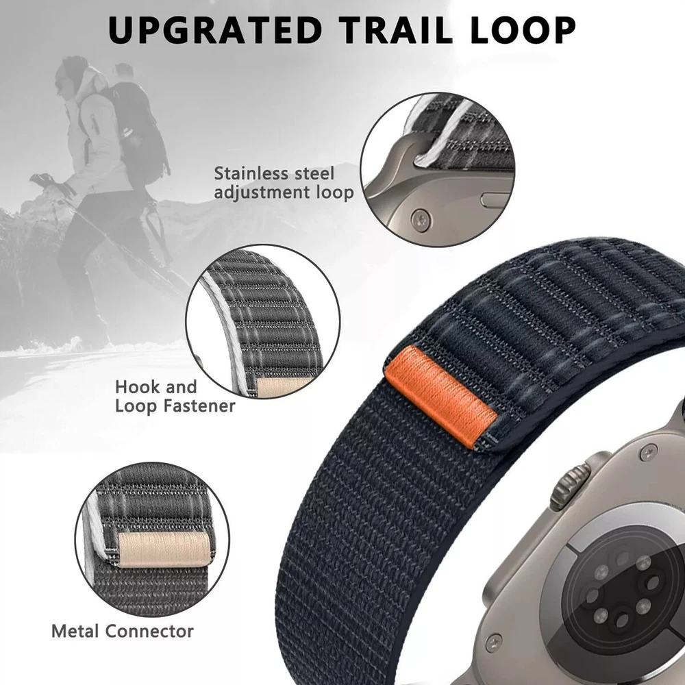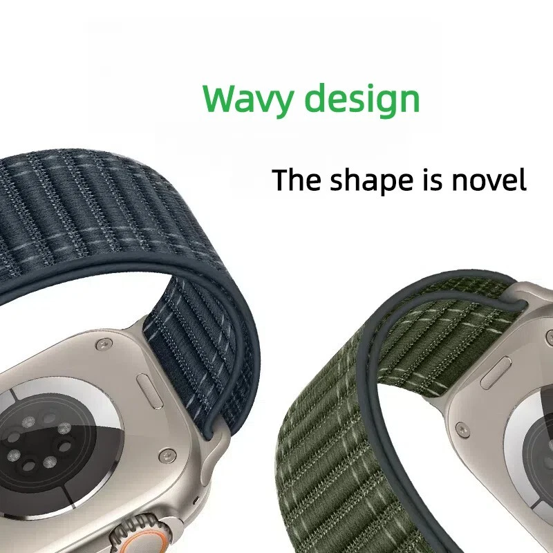 New wave pattern nylon strap for Apple Watch 10 9 8 SE Ultra 2 42/44/45/46/49mm Features: 【 Premium Material 】 Made of tough, durable nylon, this watch strap excels in challenging conditions. Its soft, finely woven texture, combined with enhanced elasticity, ensures remarkable comfort. The skin-facing side is tightly woven, offering a soft cushion and a premium feel. 【 Security & Easy to install 】 Durable Trail Loop Nylon wristbands comes with watch lugs on both ends, which locks onto watch interface precisely and securely. It can effectively prevent your apple watch from falling off and becoming loose. The upgraded linker on both ends locks precisely and securely on. Don't need any tools, easy and direct installation and one button removal. 【 For All Scenes 】 Suitable for many scenes, especially suitable for sports such as hike, run, outdoor Activities. Making the ultimate sports watch for athletes of all kinds required a unique approach. That?s why specialized bands for outdoor adventures, endurance training, and water sports are as meticulously crafted as the watch itself. 【 For Wrist Size 】 Suitable for 130-220mm (5.12"-8.66") wrists. Compatible With: > For Apple Watch Ultra / Ultra 2 > For Apple Watch Series 10 / Series 9 / Series 8 / Series 7 / Series 6 / Series 5 / Series 4 / Series 3 / Series 2 / Series 1 / > For Apple Watch Nike > For Apple Watch Hermes > For Apple Watch SE Package Includes: 1x wave pattern nylon strap !!! ( PS: The Apple Watch is Not Included )