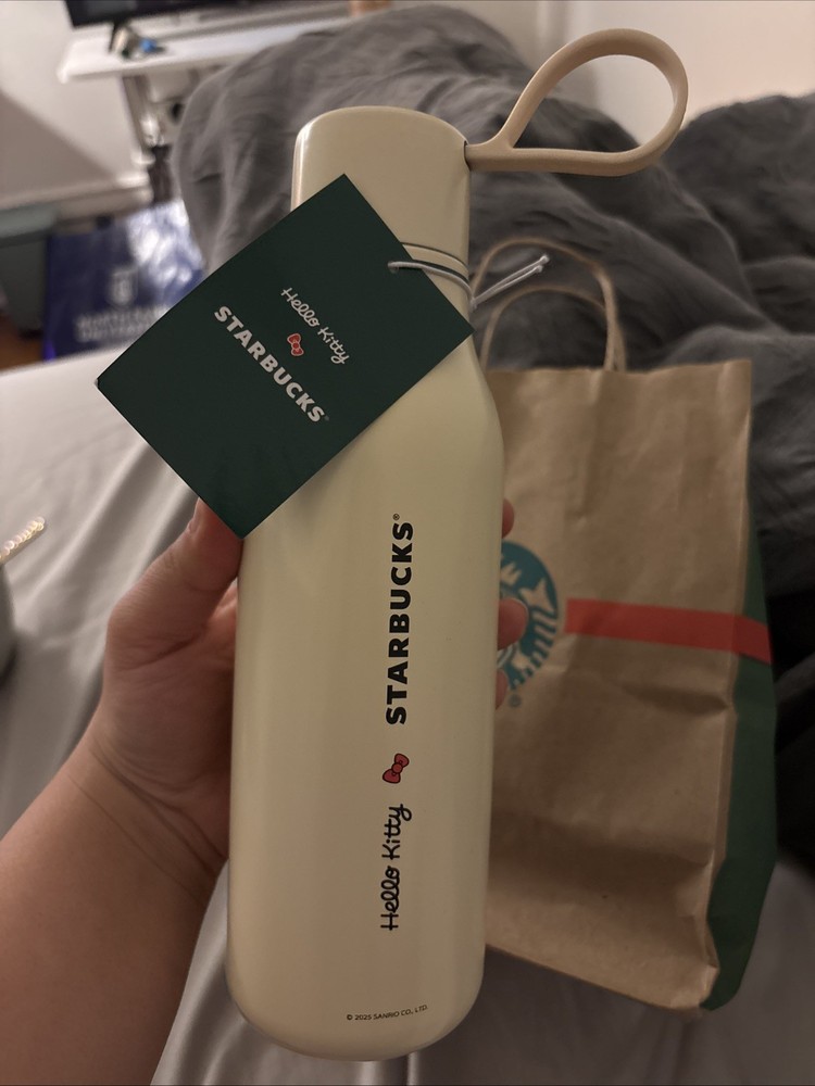 The product is a Starbucks x Hello Kitty 20oz Stainless Steel Water Bottle Tumbler, showcasing a collaboration between Starbucks and Hello Kitty. This water bottle tumbler is super cute. HANDWASH ONLY