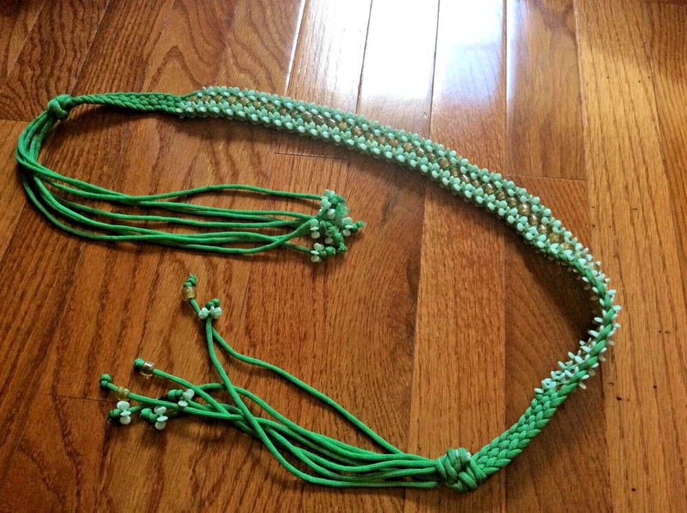 gtin13:Does not applyAccents:BeadedMPN:naType:BeltPattern:FloralBrand:HandmadeSize:45" longStyle:Waist BeltCountry of Origin:IndiaHardware Material:Not applicableVintage:NoDepartment:WomenWidth:1"Handmade:YesMaterial:NylonWaist Size:adjustableBelt Width:NormalCharacter:JadeFeatures:Handknotted, Beaded, Sequined, renaissance, prom, bridesmaidSize Type:RegularTheme:Beaded, bridesmaid, prom, bohoColor:GreenModified Item:NoUPC:Does not applySeller Notes:“Very nice, Jade green apple color, citrine color beads, very durable”Personalize:No