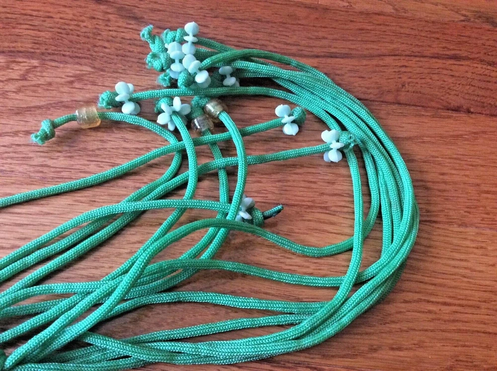 This is 45" long and you can knot it up at your waist if need be probably Nylon thread, very very durable