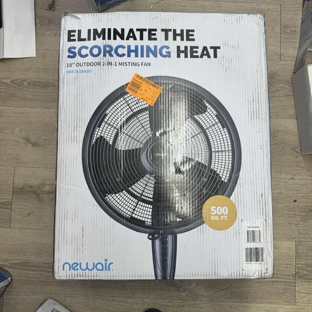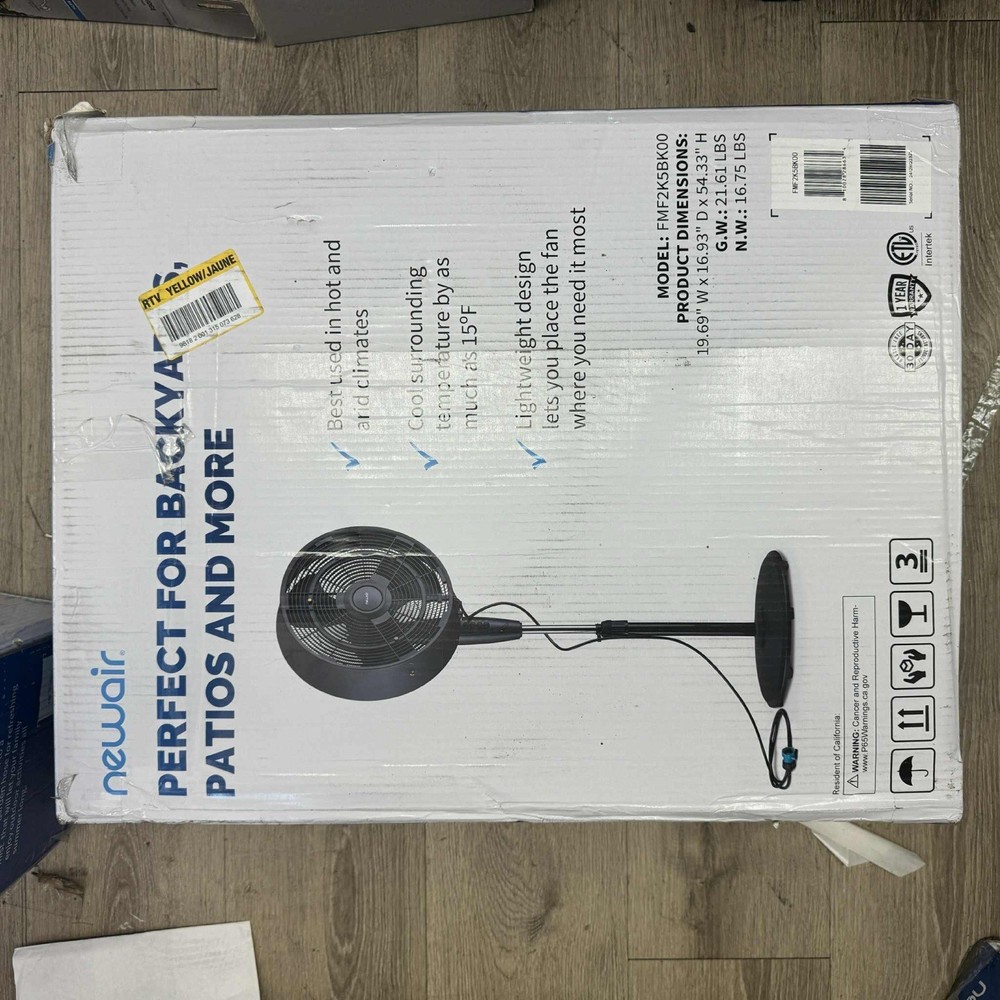 The Newair Outdoor Misting Fan is a versatile and convenient way to beat the heat on your patio or deck. With its lightweight and portable design, it can be easily moved from one location to another, providing instant relief from the sweltering heat. Its user-friendly features make it a breeze to use, even straight out of the box. Simply plug it in, and it's ready to go! The fan's oscillating function and powerful 1,600-CFM output provide a refreshing cool breeze that can cover up to 500 square feet. And with the ability to connect to a standard garden hose, it offers a refreshing mist that can reduce temperatures by 10-15 degrees, perfect for hot and arid days. Whether you need a quick cool down after a workout or are hosting an outdoor gathering, the Newair Outdoor Misting Fan is the ideal solution for staying cool and comfortable. Fully adjustable fan head and height 3 convenient fan speeds Cools 500 sq. ft. Push button controls Durable outdoor design Oscillating option High energy efficiency Black finish Connects to a garden hose Large 18 in. fan Click here for more information on Electronic Recycling Programs Return Policy Product Information Internet # 311195933 Model # FMF2K5BK00 UPC Code # 853138006860 Store SKU # 1004687232 147852804