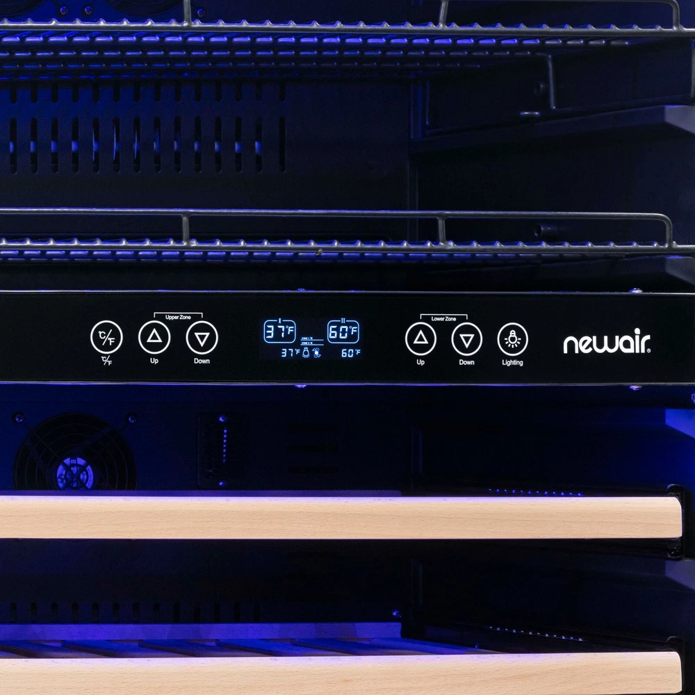Get ready to party with the Newair AWB-400DB Dual Zone Wine and Beverage Fridge. This handy beverage cooler has two cooling zones so you can keep both wine and beer at the perfect temperature for serving. Easy-slide wine racks and the innovative SplitShelf™ configuration help maximize storage space so your well never runs dry while you're entertaining. 1. One Complete Package for Chilling All Your Drinks: With two temperature zones in one handy fridge, you can keep up to 20 wine bottles on the bottom and up to 70 standard beer or soda cans on the top. Use the digital temperature control to keep your wine and carbonated drinks at the ideal temperature for serving. 2. Maximize Space With SplitShelf™ Configuration: The AWB-400DB features clever SplitShelf™ configuration that allows you to double the number of cans you store. The half-depth shelves let you stack cans with different footprints on top of each other. Prefer bottles? Place them in front of a half shelf so they can stand upright. With SplitShelf™, you've got options. 3. A Compact Wine Cellar for Your Favorite Bottles: Keep your wine collection at the perfect temperature for short-term storage or long-term aging in dedicated wine racks. Smooth gliding shelves minimize vibration to keep sediment from churning while allowing you to easily read the labels as you choose your vintage. 4. Fits in Nearly Any Room Where You Want to Serve Drinks: The front-venting compressor system allows you to slide this beverage refrigerator in under any standard-height counter for a sleek, built-in look for your kitchen. It’s solid black sides and stainless steel door also look great in stand-alone applications for your home bar, man cave and more. 5. Beautiful, Durable Design Touches: The double-pane glass door keeps cold air inside for maximum efficiency, while the adjustable interior LEDs bathe your drinks in a chic blue light. Durable stainless steel doors resist scratches. There's even a lock and key to keep your adult beverages safe from curious little hands.