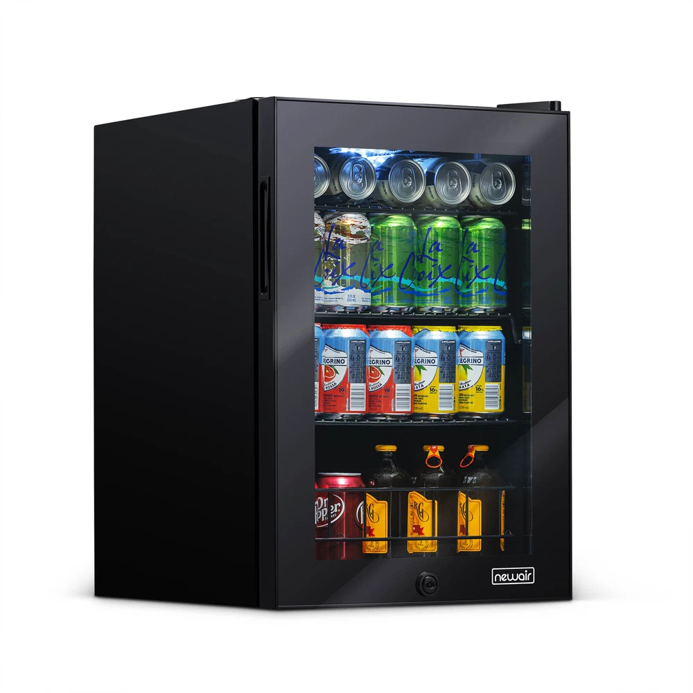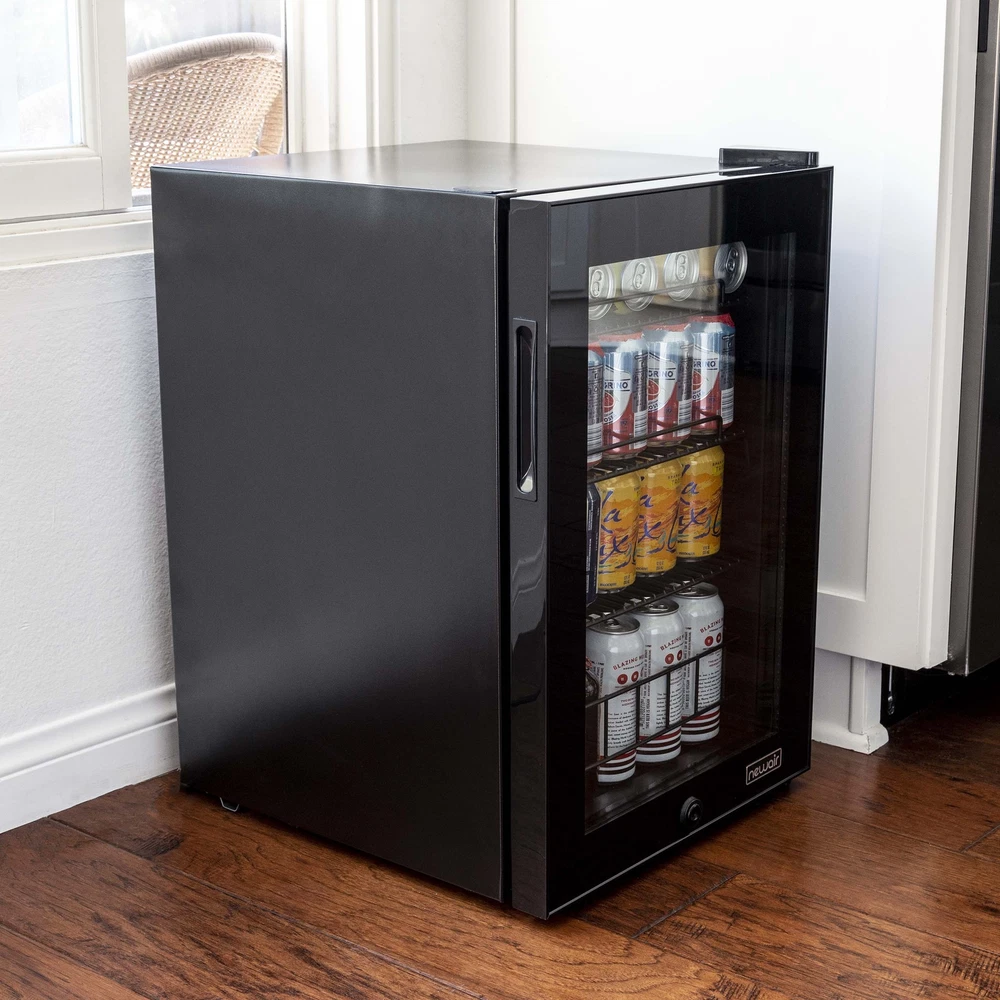 Keep all your favorite beverages perfectly chilled and ready to serve in the Newair 90 Can Compact Beverage Fridge. The freestanding design is ready to use out of the box, and adjustable shelves let you create customized storage for different sized cans and bottles. 1. Powerful and Capable Compressor: The Newair 90 Can Compact Beverage Fridge features a powerful compressor cooling system that keeps your drinks at a consistently chill 37 degrees for optimum refreshment. Choose from 7 custom thermostat settings to keep beer and soda at the perfect temperature for serving. 2. Compact Design Has Room for 90 Standard Cans: At just 16.9 inches wide and 25.4 inches high, this little fridge packs a big punch. With the capacity to hold up to 90 standard cans, you can fit all the drinks you want inside - without having to redesign your kitchen or home bar to make room for a larger appliance. 3. Removable Storage Shelves for Flexibility: The interior shelves of the Newair 90 cans freestanding beverage cooler can be adjusted to make room for oversized bottles and containers of all shapes and sizes so you can keep all your drinks in one place. The interior LED light is also adjustable. 4. The Use-it-Anywhere Beverage Fridge: The Newair 90 Can Compact Beverage Fridge doesn't require special installation or new cabinets to get started - just plug it in and you're ready to go. Its sleek black finish and LED interior light guarantee that it looks great anywhere. 5. Double-Paned Doors Keep It Cold: Double-paned glass doors provide outstanding insulation to keep all that cold air inside. They also provide on-trend good looks and an easy way to find exactly the right beverage when company calls. 6. Keep Drinks Away from Curious Kids: Whether you have toddlers or teens, not every drink is appropriate for every member of the household. The Newair 90 Can Compact Beverage Fridge in Black comes equipped with an integrated lock and key to keep adult beverages safely out of curious hands. It's the perfect beverage fridge for families who have safety in mind.
