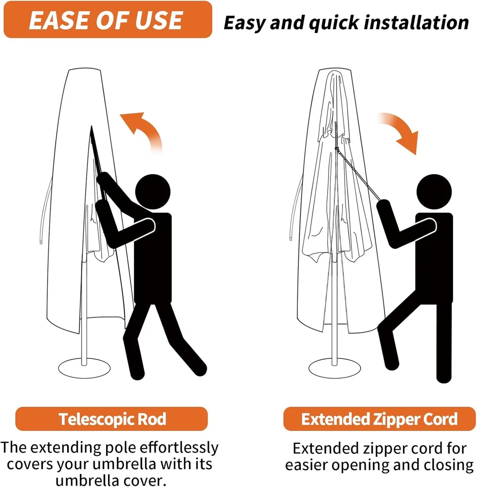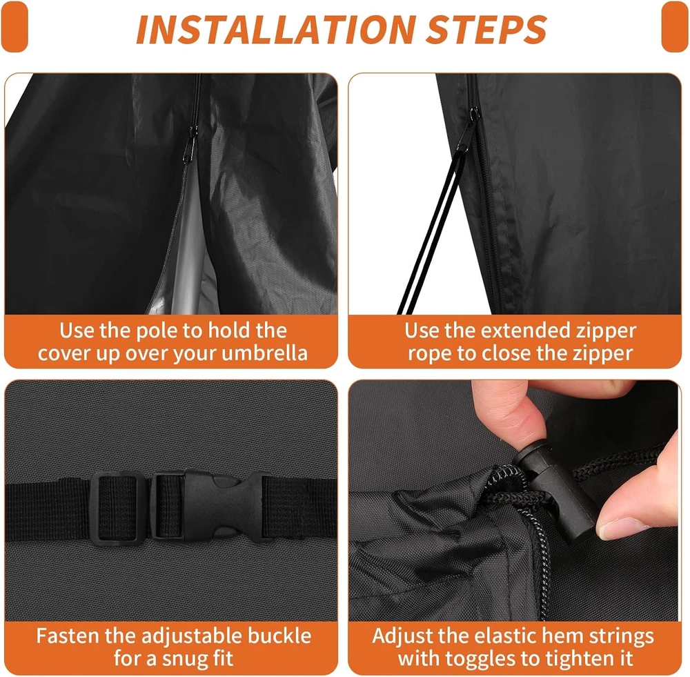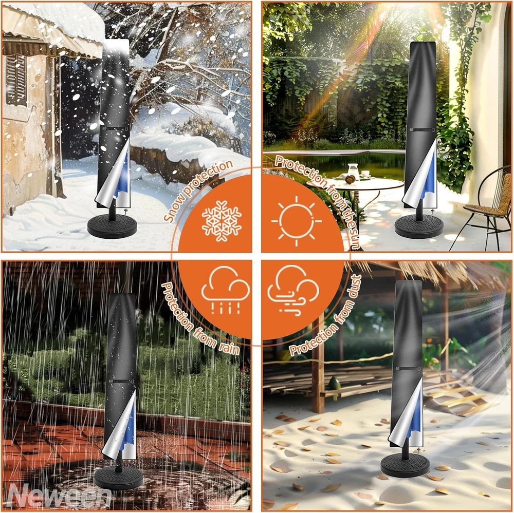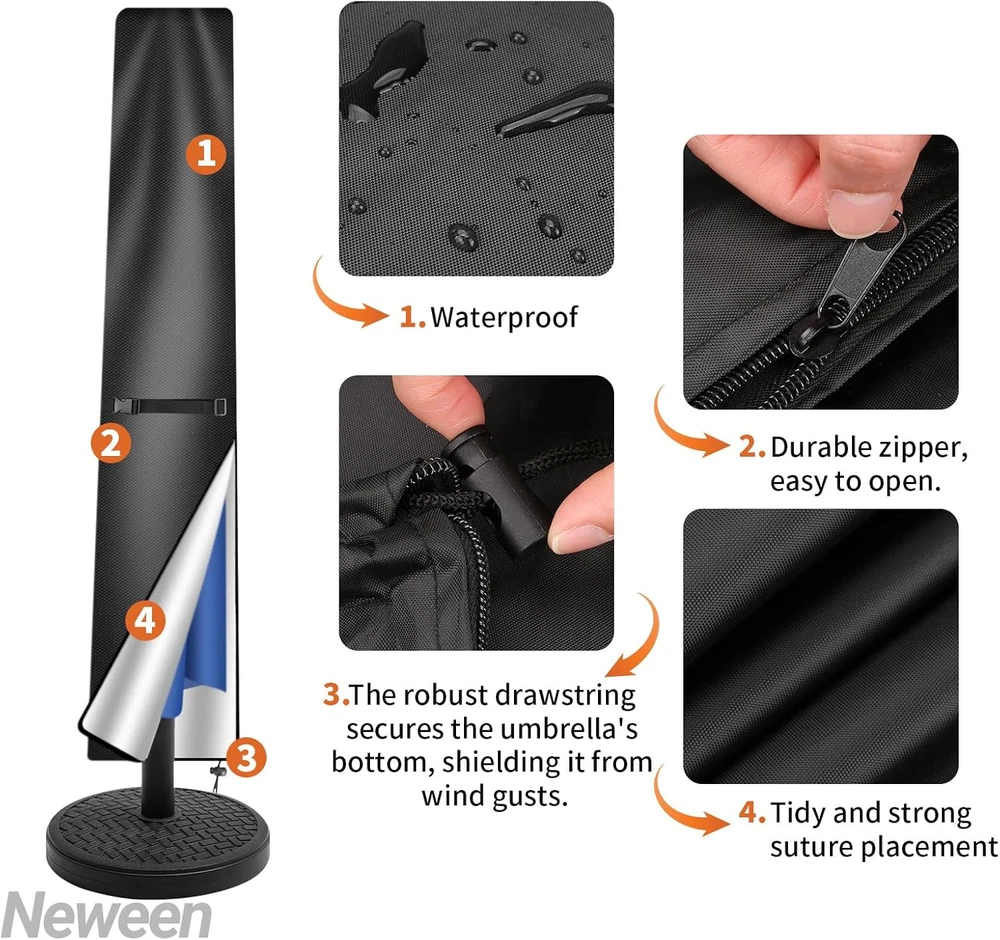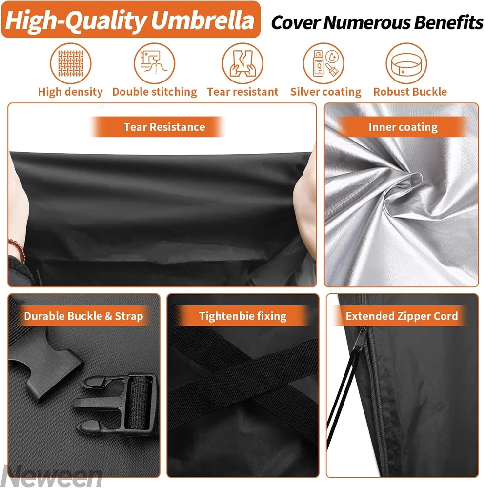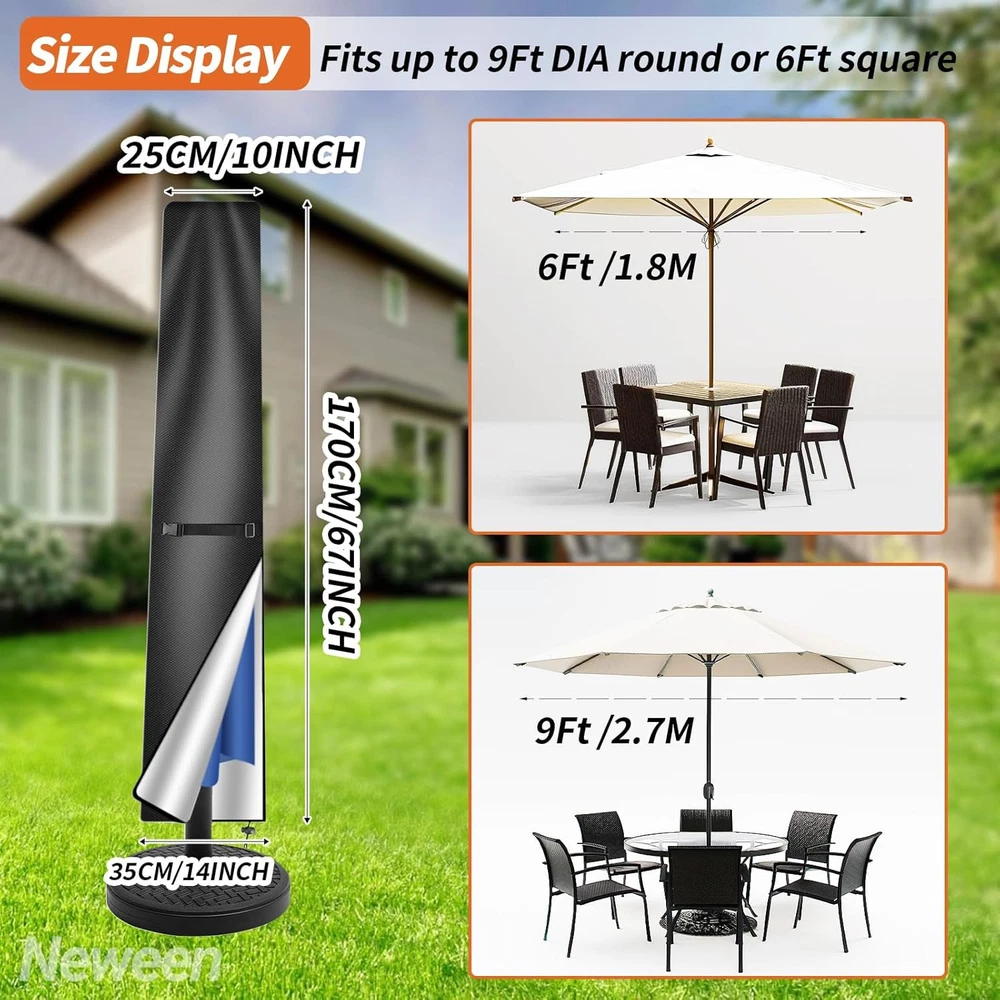 Neween Patio Umbrella Cover For 6'-9' Market Umbrella, Black Product Details Closure Type: Buckle,Cord,Drawstring,Fold,Strap,Zipper Strap Type: Drawstring Package Dimensions: 11.85 x 8.58 x 2.01 inches Item Weight: 6.4 ounces Manufacturer: Neween Item model number: For 6'-9' Market Umbrella Material: Polyester Color: Black Brand: Neween Item Weight: 6.35 Ounces Water Resistance Level: Waterproof QUALITY MATERIAL -- The outdoor patio umbrella cover is made of 210D oxford material with an inner layer that has a silver coating that can protect against getting wet during the rain or snow, reflects the sunlight, and protects the parasol from damage. WITH TELESCOPIC POLE -- Each offset/market umbrella cover is equipped with a telescopic rod, convenient and easy to lift the umbrella cover up and off without a ladder. WINDPROOF DESIGN -- With the adjustable buckle strap which is stitched on at the middle of the parasol, and the all round drawstring bottom with cord locks for extra security to ensure the parasol cover does not blow away. EASY TO STORE -- The package includes 1 x waterproof patio umbrella cover, 1 x storage bag, 1 x telescopic rod. Our umbrella cover can fold down and pack in a storage bag for easy storage. Wipes with a damp cloth or hose down with running water and let it dry under the sun for next use.