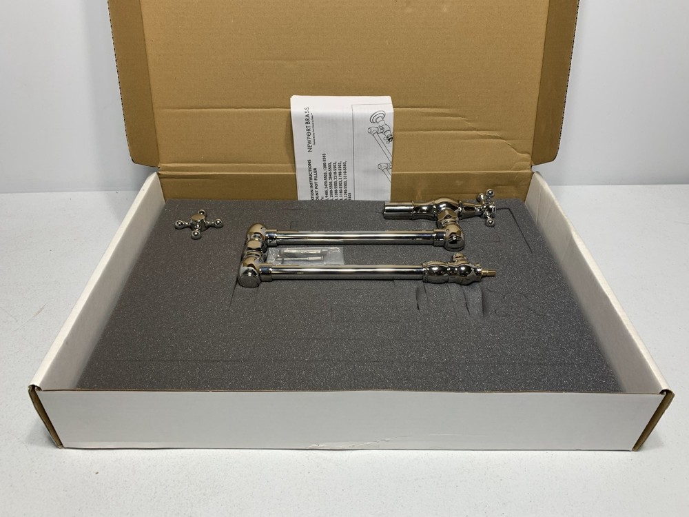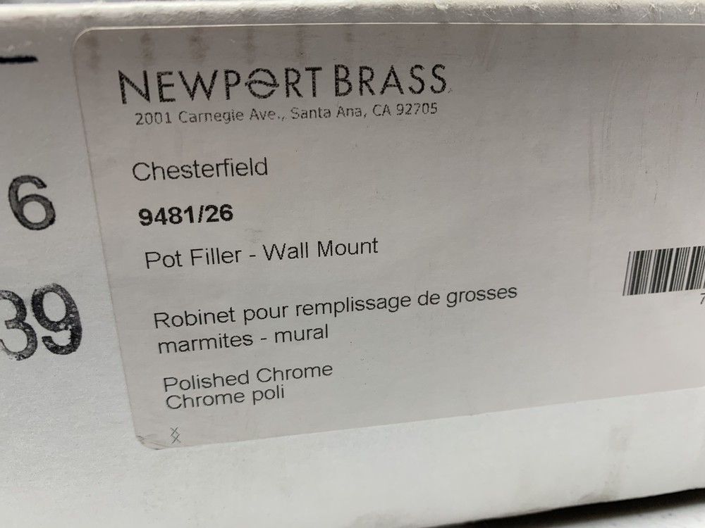 This is a NEW - unused Newport Brass 9481/26 Chesterfield Pot Filler Wall Mount Polished Chrome Buyers and Re-sellers, don't miss this opportunity to purchase quality surplus equipment at a great price! There are many more surplus parts on our store, check it out! Return Policy: Returns are accepted within 60 days of the delivery date. Rest assured we will cover all return shipping costs! All returns must be in "as shipped" original condition to qualify for a refund. Photos of packing and product is required for damaged items. Customer returns that satisfy all of the above requirements will be issued a refund including any applicable sales tax Newport Brass 9481 Features: Covered under Newport Brass's limited lifetime warranty and limited lifetime commercial warranty Faucet body constructed of brass Single hole mounting type Wall mounted faucet installs on the wall directly above sink Swivel spout allows for greater access to all areas of the sink 2 cross handles control the flow and temperature of water Includes cartridge Mounting hardware included Low lead compliant Newport Brass 9481 Specifications: Height: 7-15/16" Spout Reach: 21-3/16" (center of faucet body to center of spout outlet) Flow Rate: 4.5 gallons-per-minute Faucet Holes: 1 (holes needed to install faucet)
