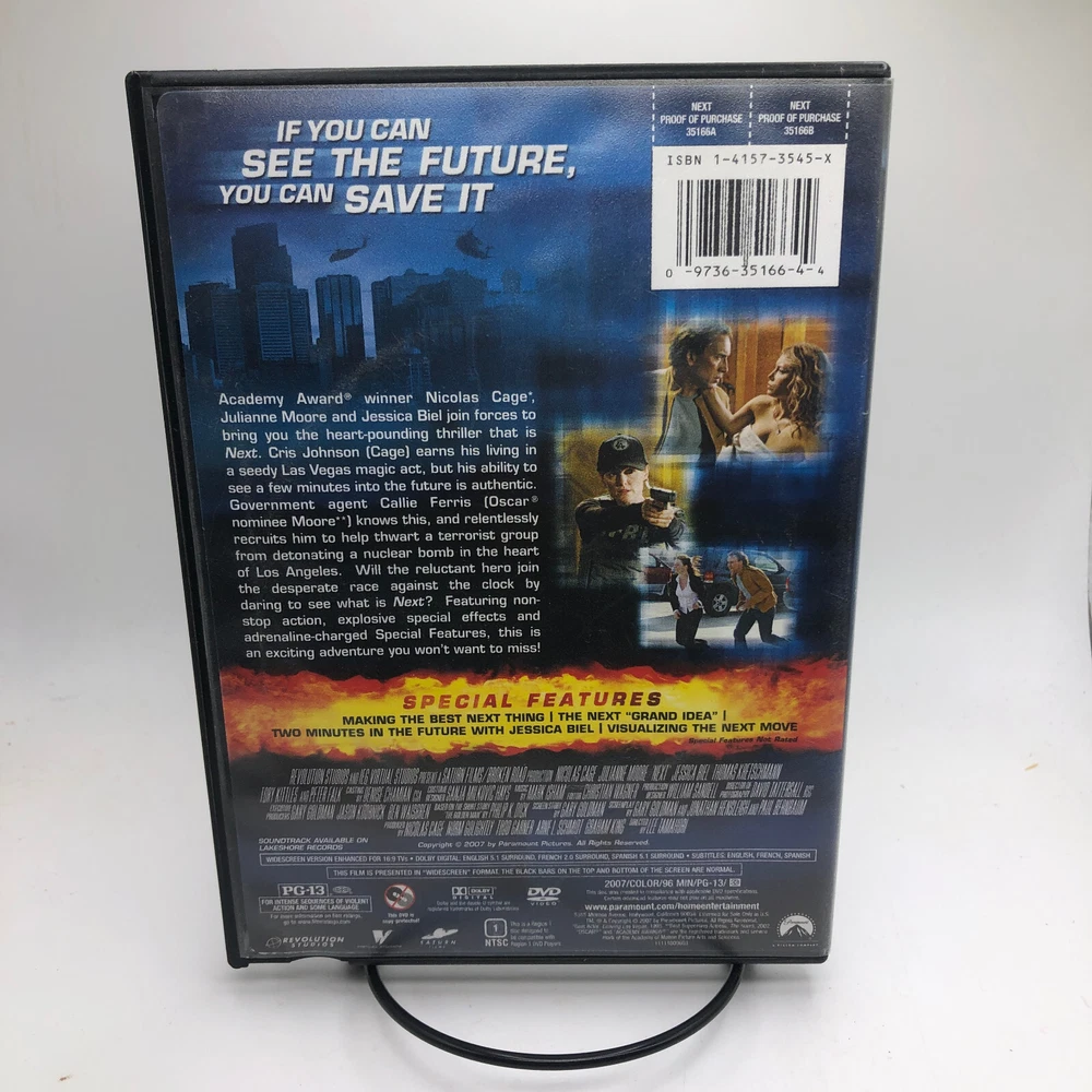 Type: Movie Release Year: 2007 Country/Region of Manufacture: United States Genre: Action & Adventure UPC: 0097363516644 Format: DVD Seller Notes: “Please see photos. All USED Movies will have some minor scratches and blemishes on cases.” gtin13: 0097363516644 Director: Lee Tamahori Movie/TV Title: Next Region Code: DVD: 1 (US, Canada...) Case Type: Tall/DVD Case Language: English Actor: Julianne Moore, Nicolas Cage, Jessica Biel Rating: PG-13