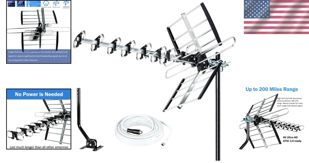 Next-Gen 4K HDTV Antenna with 40ft Coax Cable & Splitter for Multi-TV Support ‹ › ‹ › ‹ › ‹ › ‹ › ‹ › ‹ › ‹ › ‹ › Next-Gen 4K HDTV Antenna Upgrade your viewing experience with our state-of-the-art outdoor antenna, perfect for cutting the cord and accessing crystal-clear 1080p and 4K reception for FREE! Key Features: 2024 UPDATED YAGI OUTDOOR ANTENNA - Reception up to 200 miles from TV transmitters for stunning picture quality. Supports both VHF and UHF signals for excellent broadcasting range. NEXT-GEN TECHNOLOGY: 4K ULTRA HD and ATSC 3.0 READY for future-proof entertainment. Includes a 40ft coax cable and optional TV splitter for multi-TV support. SLEEK AND INNOVATIVE DESIGN with extended length for enhanced signal reception. HASSLE-FREE ASSEMBLY with simplified instructions for easy setup. Benefits: Eliminate expensive cable or satellite bills while enjoying unlimited entertainment. Discover a plethora of FREE over-the-air stations, including live sports and local news. Designed for easy mounting—install it on roofs, attics, or outside your home. Unmatched stability and performance with longer and larger receiving elements. Enjoy savings now, and relish the freedom of viewing your favorite channels without subscriptions. Why Choose Our Next-Gen 4K HDTV Antenna? Say goodbye to the limitations of cable TV and hello to endless entertainment possibilities. Our Next-Gen 4K HDTV Antenna delivers superior reception, allowing you to access a wealth of HD content from the comfort of your home. Conveniently designed for robust signal reception, our antenna not only enhances your viewing experience but also saves you money in the long run. Don’t wait—elevate your TV experience with our advanced antenna and join the wave of wise viewers enjoying crystal-clear broadcasts without the hassle of hefty bills. Shipping Free & Fast Shipping - We offer free shipping to most of the USA with a normal delivery time of 3-7 days. However, due to the current situation, additional delivery time (up to 3 weeks) may be required for some items. Alternative Carriers - We may use alternative carriers (e.g. USPS, FedEx, UPS, etc.) to ensure your package arrives safely and on time. Due to the use of multiple carriers, we are unable to provide a tracking number automatically. Handling Time - Orders are processed and shipped within 1-2 business days of receiving cleared payment. Shipping Restrictions - Shipping to Alaska, Hawaii, Puerto Rico, Guam, and other US territories may incur shipping charges or delivery restrictions. Please contact us before ordering, or your order can be refunded/cancelled. State Restrictions - There may be restrictions based on your state of purchase. For example, certain items may not be shipped to California due to state regulations. Contact for Tracking Updates - If you require tracking updates or have any concerns about the delivery of your order, please feel free to contact us, and we will be happy to assist you. Return 30-Day Hassle-Free Returns - We want you to be completely satisfied with your purchase. If you are not, you can return the item within 30 days of receiving it for a full refund or exchange. Easy Return Process - To start a return, simply contact us and we will provide you with a prepaid return shipping label and detailed instructions. Restocking Fee - There are no restocking fees for returns. However, the buyer is responsible for return shipping costs if the return is not due to a seller's error. Refund Processing Time - Refunds will be processed within 5 business days of receiving the returned item in its original condition. Payment We accept all major credit cards, PayPal, and Apple Pay for your convenience. Your payment information is secure and encrypted to ensure a safe and seamless transaction. Please complete your payment within 3 days of purchase to avoid any delays in shipping. Feedback Your feedback is extremely important to us. We strive to provide the best products and customer service possible. If you are satisfied with your purchase, please take a moment to leave us a positive review. If you have any concerns or issues with your order, please contact us before leaving negative feedback. We are committed to resolving any problems and ensuring your satisfaction. Contact Us If you have any questions or concerns, please feel free to reach out to our customer support team. You can contact us through the eBay messaging system. We are available Monday to Friday, 9:00 am to 5:00 pm EST, and we will do our best to respond to your inquiry within 24 hours. Buy it now and enjoy a pleasant shopping experience! UPC: Not Set Unit Quantity: 1 Item Weight: 6.52 lb Year Manufactured: Not Set Band: UHF,VHF Features: Yes,4K Ultra HD,ATSC 3.0 Ready,Includes Mounting Hardware,Supports Multiple TVs,Easy Assembly Compatible Service: Not Set Directivity: Mono-Directional,Omni-Directional,Bi-Directional Compatible Brand: Not Set Compatible Product: Base Station Radio,Mobile/In-Vehicle Radio,Portable/Handheld Radio Brand: Unbranded Type: Antenna Model: HDTV Antenna MPN: Not Set Unit Type: Unit Number of Inputs: 1 Number of Outputs: 4 Color: Silver Maximum Range: 200 miles Reflector Shape: Flat Country/Region of Manufacture: Not Set Size: 17.5 in x 9 in x 6 in Dish Surface: Solid Material: Plastic Dish Focus: Prime Focus Compatible Series: Not Set Manufacturer Warranty: Not Set