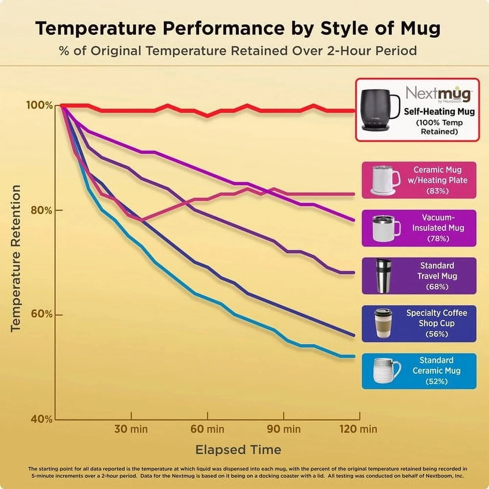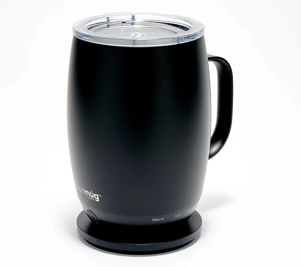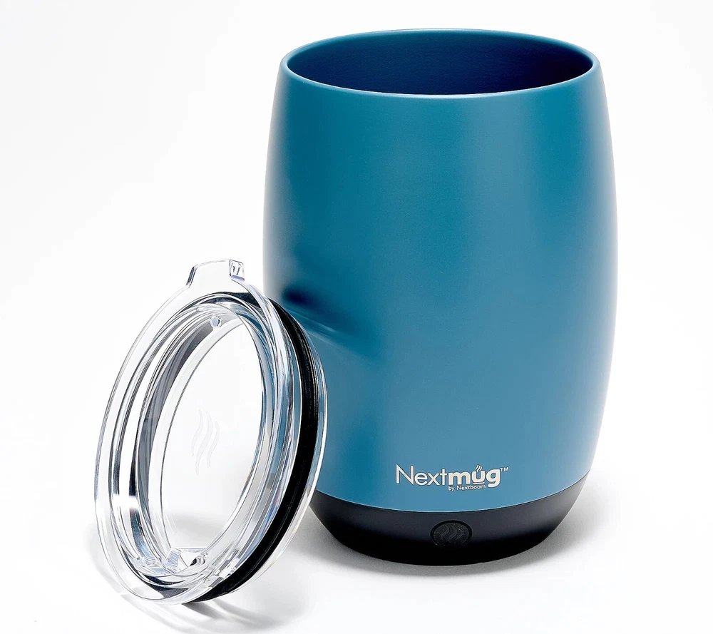 Keep your next cuppa at the perfect temp with this self-heating mug. Whatever your sip of choice, with the NextMug, you just set your preferred temperature and your beverage will stay piping hot/warm sip after sip (ideal for keeping those venti's hot till the last drop). It only takes seconds for a morning's worth of satisfaction. From NextMug. Includes 18-oz mug, lid, and docking station Temperature-controlled Three heat settings Recommended to use the lid while traveling Keeps beverages piping hot (145F) up to 3.5 hours; lid on, cup off charging coaster Keeps beverages hot (135F) up to four hours and 40 minutes; lid on, cup off charging coaster Keeps beverages warm (125F) up to 5 hours and 50 minutes; lid on, cup off charging coaster Keeps beverages piping hot (145F) up to one hour and 10 minutes; lid off, cup off charging coaster Keeps beverages hot (135F) up to 1 hour and 53 minutes; lid off, cup off charging coaster Keeps beverages warm (125F) up to two hours and 39 minutes; lid off, cup off charging coaster Imported