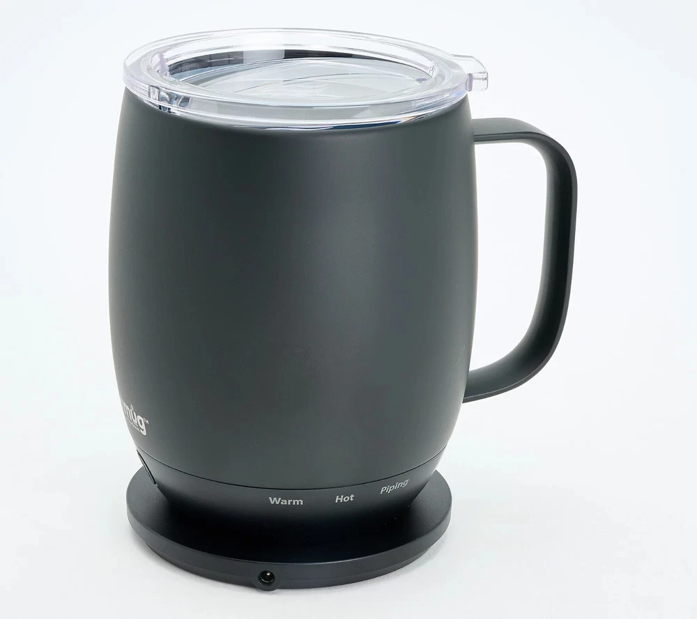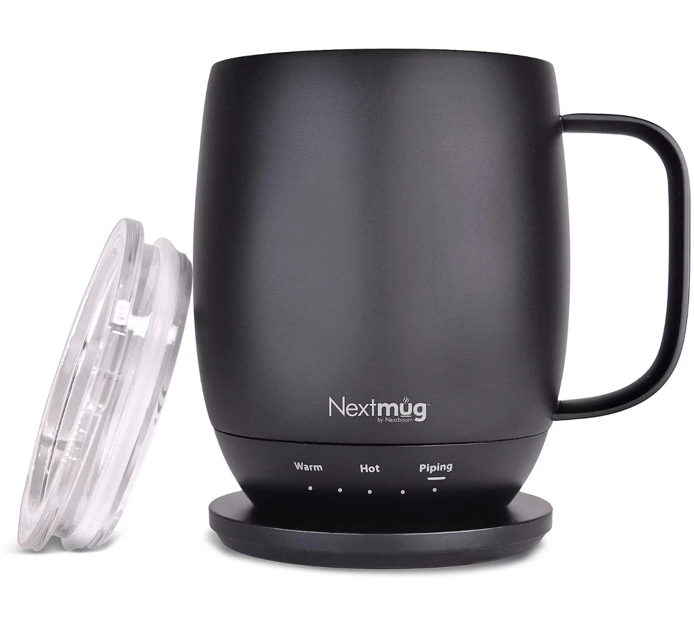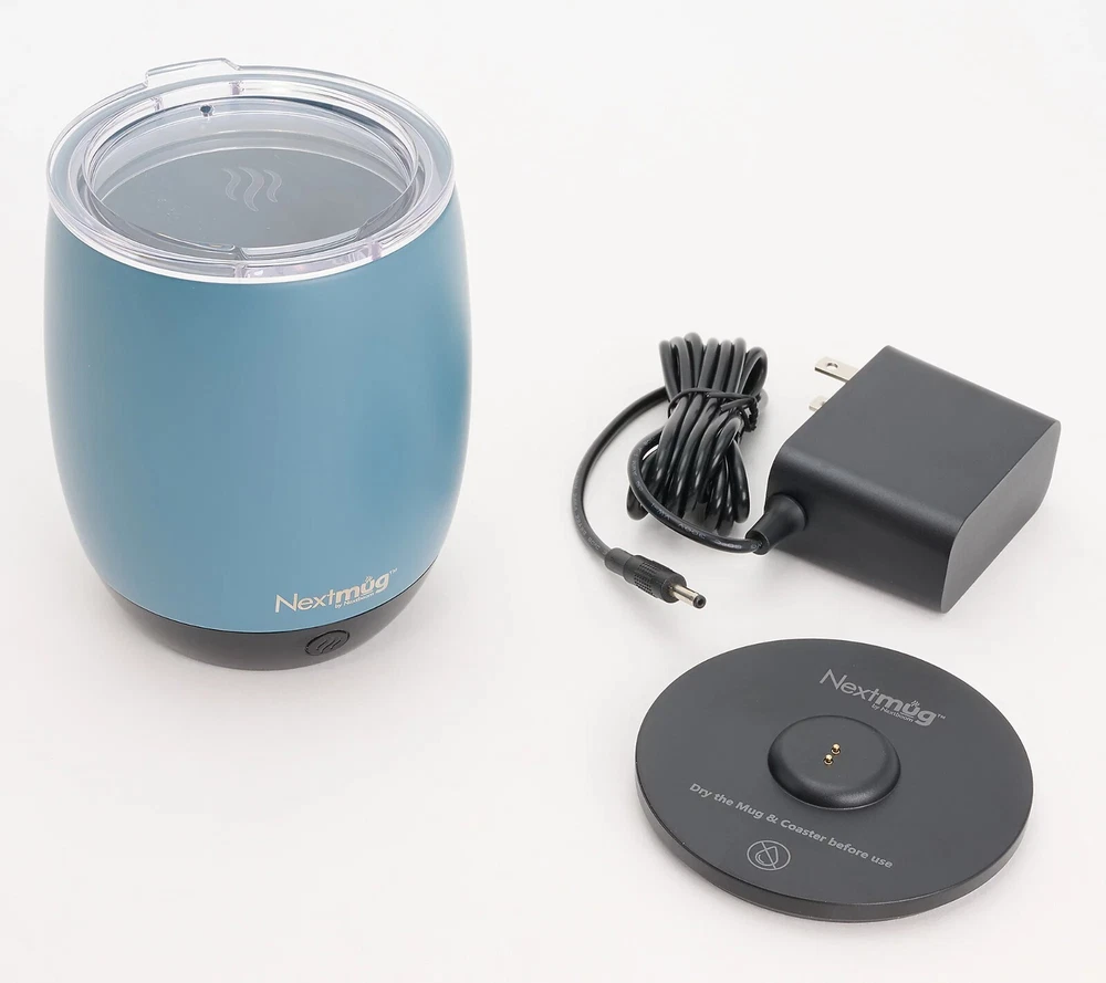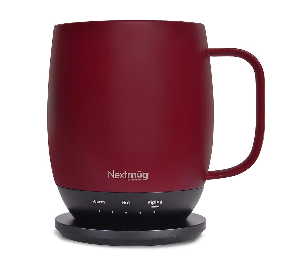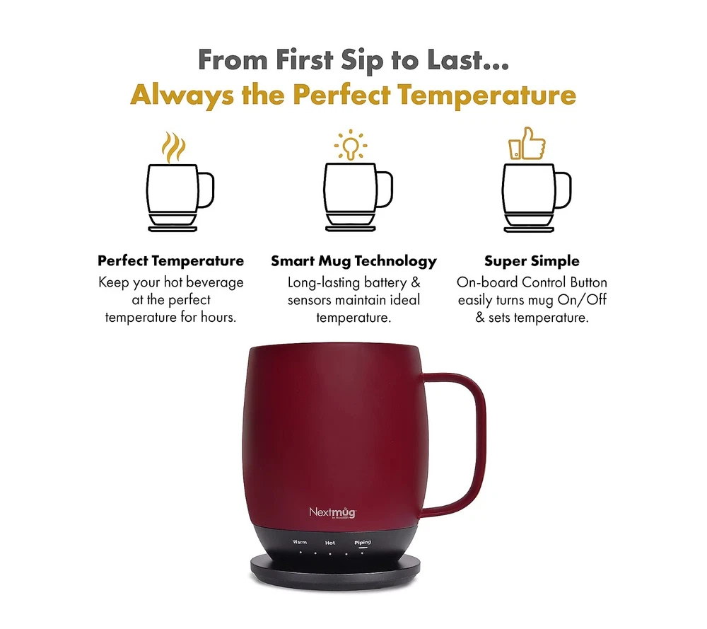 Keep your next cuppa at the perfect temp with this self-heating mug. Whatever your sip of choice, with the NextMug, you just set your preferred temperature and your beverage will stay piping hot/warm sip after sip (ideal for keeping those venti's hot till the last drop). It only takes seconds for a morning's worth of satisfaction. From NextMug. Includes 14-oz NextMug with lid, docking coaster, and charging cord On/off and temperature control buttons Auto off Keeps beverages piping hot (145F) up to three hours; lid on, cup off charging coaster Keeps beverages hot (135F) up to four hours; lid on, cup off charging coaster Keeps beverages warm (125F) up to 4.5 hours; lid on, cup off charging coaster Keeps beverages piping hot (145F) up to one hour; lid off, cup off charging coaster Keeps beverages hot (135F) up to 1.5 hours; lid off, cup off charging coaster Keeps beverages warm (125F) up to two hours; lid off, cup off charging coaster Rechargeable lithium-ion battery Approximate measurements: Mug 4" x 4.5" x 5"; Docking station 3.5" x 5"