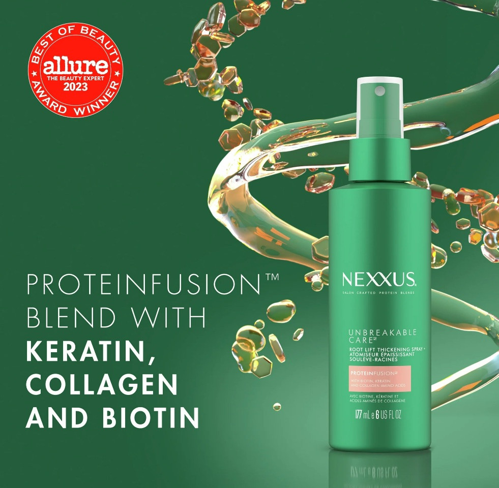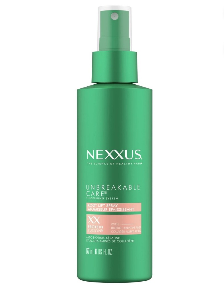 Nexxus Root Lift Thickening Hairspray Unbreakable Care + Biotin & Keratin, 6 oz. Nexxus Root Lift Thickening Hairspray Unbreakable Care, 6 oz. Experience the Unbreakable Care Root Lift Spray by Nexxus. This powerful formula of root thickening spray is your secret weapon for achieving voluminous, full-bodied hair that defies gravity. Powered by cutting-edge science, our root lift spray features an exclusive strand-expanding technology that thickens each individual strand from root to tip, creating lasting volume and bounce that lasts all day. Say goodbye to flat, dull hair and hello to hair that grabs attention with its luxurious thickness and vitality. Formulated with our signature ProteinFusion blend enriched with biotin, keratin, and collagen amino acids, this spray strengthens and protects your hair from within, ensuring it stays healthy and resilient against daily styling and environmental stress. How to use: It's simple to apply. For adult use. Nexxus Root Lift Thickening Hairspray Unbreakable Care, 6 oz UNBREAKABLE CARE SPRAY: This root-thickening spray lifts roots, visibly thickens strands, and protects hair from heat and breakage. SEE THE SCIENCE: This root lift spray contains our exclusive strand-expanding technology that thickens each strand from root to tip to help create lasting volume and bounce. PROTEINFUSION INGREDIENT BLEND: Infused with biotin, keratin, and collagen amino acids, our formula strengthens and protects from within. HOW TO USE: Section damp hair and spray directly onto the scalp and throughout the hair for overall fullness. Gently massage into the scalp, and do not rinse. Style as usual. SALON-QUALITY HAIR PROTECTION: Nexxus hair products were born in salons and perfected by science, using high-performing technology and top-quality ingredients. UNBREAKABLE CARE COLLECTION: This haircare range is formulated to help retain hair by reducing breakage while maximizing fullness. For adult use.