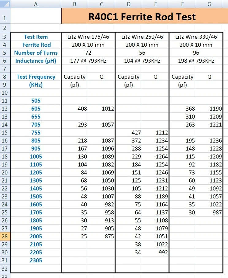 We are a reliable source for many of your litz wire and crystal radio part needs. Since 2008, we've sold more than 19,000 orders with excellent customer feedback. Please visit our eBay Store at mkmak222_Litz Wire to see what is currently available. We have over a hundred types of litz wire in stock. They contain 5 to 1725 strands of AWG 48 to 28 (0.03 mm to 0.32 mm) wire. The litz wire's equivalent AWG are from AWG 36 to AWG 4. If you don’t see a particular type of litz wire that you're interested in, please contact us so that we can help arrange a custom order. We can usually have these delivered in three weeks. Large orders may be purchased at the wholesale price. Most orders will be shipped within one day. The small amount of wire will be coiled on 6” or 7” diameter paper spool to prevent the destruction of the litz wire structure. Larger amounts will be coiled on the original plastic spool. Note: For avoid damage the structure of the small Litz wire, please observe photo “How to un-coil litz wire from the spool" on my eBay List. When winding a coil, in order to smoothly un-coil the Litz wire from the paper spool, the simple method is: Vertically fix a 1/4-inch diameter screw rod on a flat plate, and then put paper spool into screw rod flat. When you pull out the litz wire from the paper spool, the paper spool can rotate freely on the screw rod, and the litz wire will not be twisted and knotted. You only need an electrical solder iron to solder the litz wire. When you heat the end of litz wire, the polyester yarn insulation will be melted and recoiled, the polyurethane insulation that covers on copper strands wire will be completely volatilized, and the copper wire will be tinning . Here you are bidding on a special nickel-zinc ferrite rod. The size is 200 X 10 mm, use Ni-Zn R40C1 material. Made in China. The Products made by Ni-Zn R40C1 material are design to use for MW and shortwave antenna coils ; in high frequency applications they have low loss characteristics. The second photo above shows the characteristics of this R40C1 ferrite material . Its applied frequency is up to 50 MHz. The R40C1 Ferrite rod made by special formula. We don’t know why this type of Ferrite rod has very high Q when wind the coils for LW, MW and SW. Even though the material R40C is very close to R40C1, the Q is much lower with the same coil spec (usually not easy to reach 700Q in MW). I introduce the R40C1 here because the Crystal Radio enthusiast always wants to make coils that have high Q and want them as high as possible. The coils I wound with R40C1, are able to get 900 Q at 3 MHz, I did not measure higher than 3 MHz yet. For sure the R40C1 can use for many other applications. This field is waiting for discover by amateurs. Use this R40C1 200 X 10 mm ferrite rod and litz wire to make coils will give you a big surprise! It can get very high Q value and let the radio circuits significantly increase the selectivity and sensitivity. The third photo above shows some test results for litz wire coils with this 200 X 10 mm ferrite rod . These coils in 500 – 1600 KHz can read more than 1000 Q from a HP 4342A Q meter, the highest point at 700 KHz is 1237 Q. An amateur test these ferrite rod, 122 turns of 420/46 Litz, close wound on 200 mm ferrite rod. Coil length 6", 4.5" leads, 2.5" above deck. L=216 μH. The result are: 500 KHz - 1293 Q, 800 KHz - 1383 Q, 1900 KHz - 1124 Q. The fourth photo above shows another test results, 12 turns of 1 mm silver-plated copper wire , space wound on a plastic tube and insert the 200 mm ferrite rod, get 630 Q at 7 MHz, 470 Q at 14 MHz. For more information of this R40C1 ferrite Rod and ferrite toroid, please search " The RadioBoard Forums " on google and read all interesting articles of “ R40C1 ” in Crystal Radios section. If you need 175/46, 250/46, 270/46, 300/48, 420/48 or 675/48 litz wire to make coils for this ferrite toroid, please visit my eBay store mkmak222_Litz Wire to search these litz wire. Please e-mail any questions you may have before you order. Please make payment arrangements within 3 days. I accept PayPal only. Payment is expected within 10 days when place an order, or item will be released for sale.
