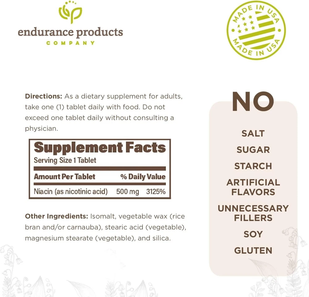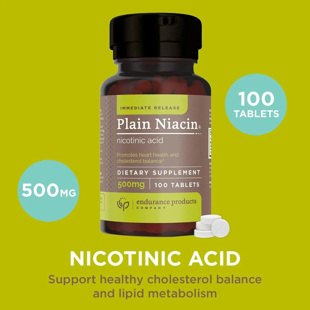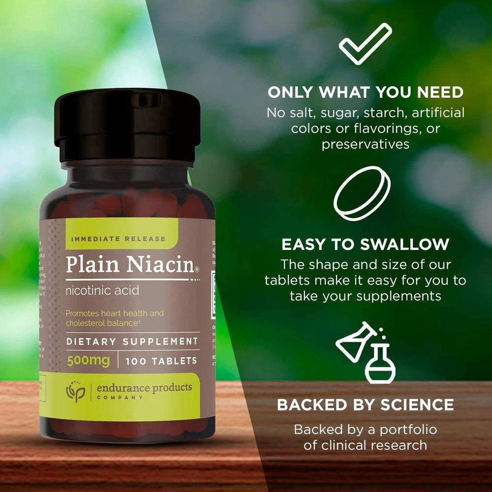 What Is Plain Niacin? Endurance Products Company’s Plain Niacin combines immediate-release nicotinic acid crystalline niacin, vitamin B) with our one-of-a-kind vegetable-based wax matrix tablet core. Tablets dissolve more slowly than traditional formulas, releasing nicotinic acid in about an hour instead of immediately thanks to our unique vegetable wax matrix. This helps reduce skin flushing and digestive upset while delivering heart health benefits.* Nicotinic acid is the only form of niacin that has been clinically shown to benefit heart health. (Nicotinamide, sometimes called flush-free niacin, does not provide the same benefits in clinical studies.)* PLAIN NIACIN - ENDURANCE PRODUCTS CO. BENEFITS OF PLAIN NIACIN Promotes heart health & cholesterol balance* Supports a healthy blood lipid profile* Supports brain and nerve function* Supports DNA replication and repair* Advanced immediate-release formula Formulated to complement doctor-recommended therapeutic lifestyle changes WHO IS IT FOR? Ideal if you want advanced nutritional support for heart health, cholesterol balance, and overall health and wellness.* EPC - A COMPANY YOU CAN TRUST Endurance Products Company is a family-owned business providing high-quality, controlled-release supplements since 1978. Our manufacturing and packaging meet strict Good Manufacturing Practices (GMP) for dietary supplements. Our products are safe for vegetarians and vegans; free of solvents, sugar, starch, and artificial coloring.