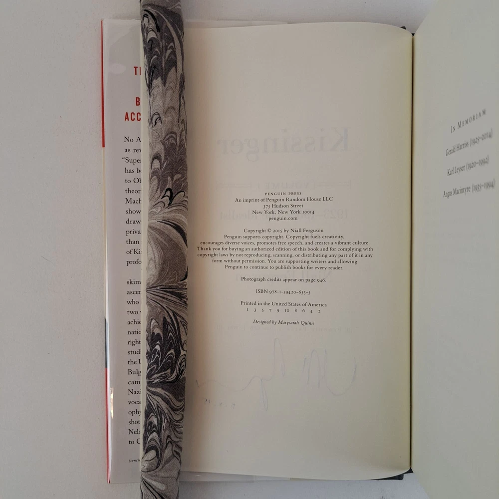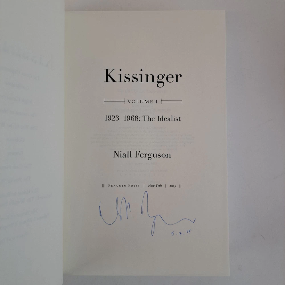 KISSINGER 1923-1968: THE IDEALIST [Signed] Author: Ferguson, Niall Title: KISSINGER 1923-1968: THE IDEALIST [Signed] Publication: New York, New York: Penguin, 2015 Edition: First Edition, First Printing Description: Octavo, 986 pages. In Very Good condition with Near Fine condition dust jacket. Spine is cream and red with a small portrait of Henry Kissinger and black and white lettering. Dust jacket protected by mylar covering, price uncut: "$60.00" on front flap. Signed flat and dated "5.X.15" by Niall Ferguson on title page. Shelved in hallway. Seller ID: 1389760 Subject: Politics, Government, and Law, US History Welcome to the eBay store of Second Story Books! DC's Oldest Rare and Used Bookstore, Second Story Books operates two open shops in the Washington D.C. metropolitan area. We have an extensive internet presence and provide accredited appraisals member ASA. This listing was created by Bibliopolis.