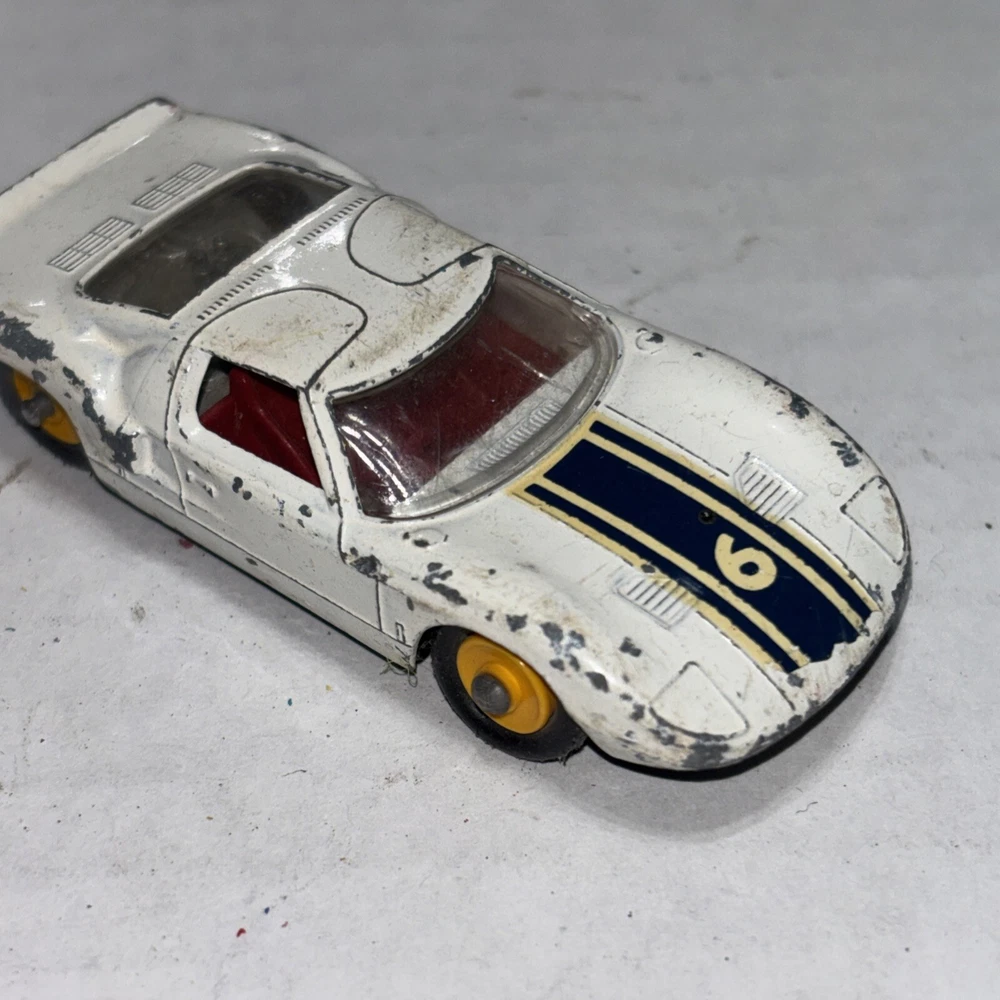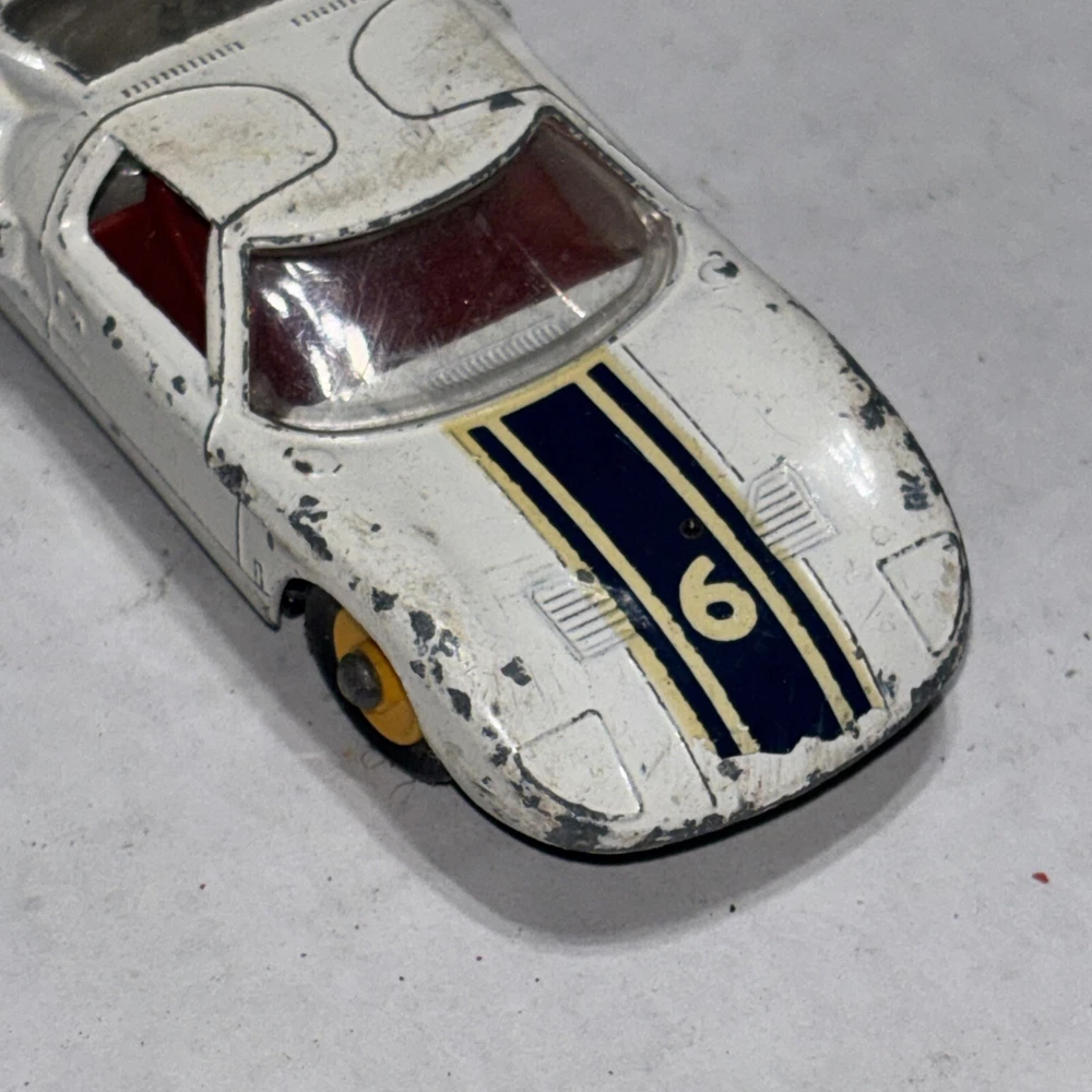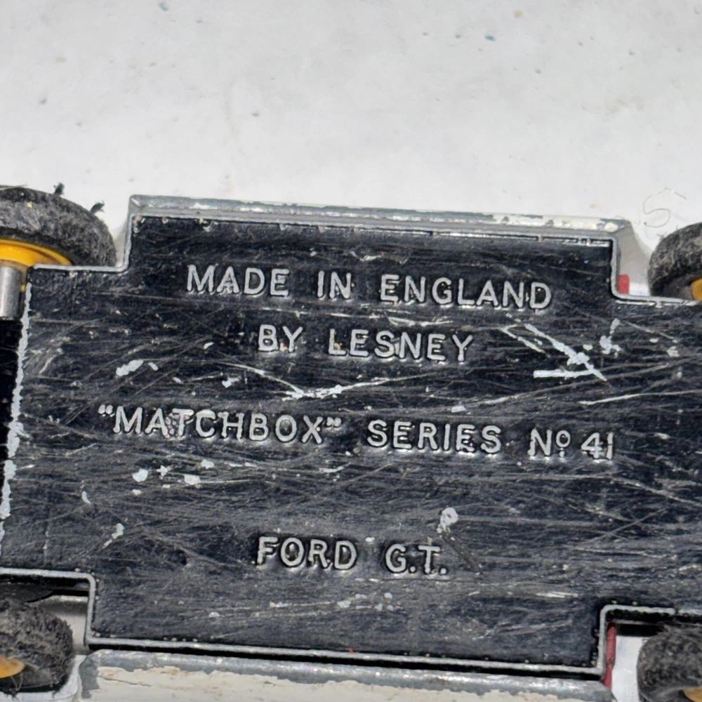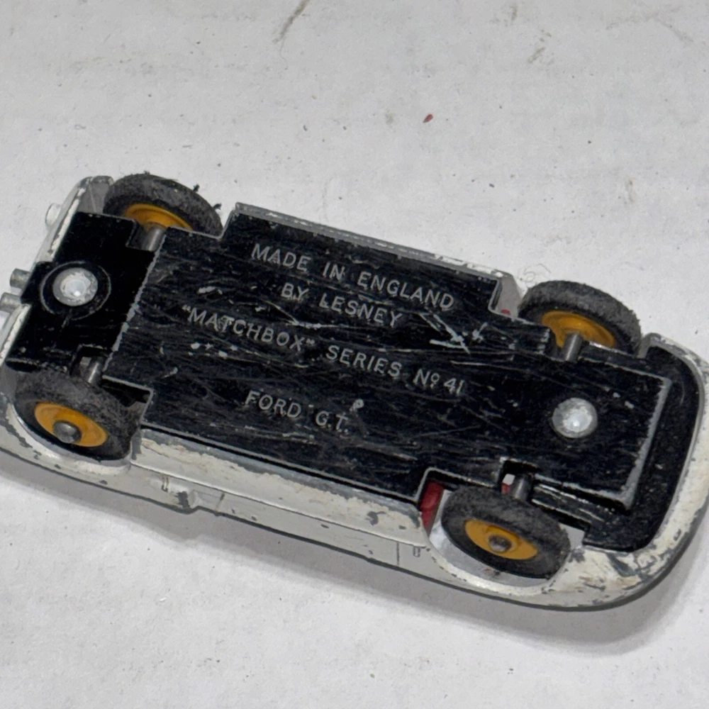 This is a vintage Matchbox Lesney Ford GT Racer #41 diecast car from the 1960s. It is in white color with yellow hubs, representing a classic Ford model. The 1:64 scale model is a part of the Matchbox Lesney series and was manufactured in England/UK. This collectible toy car is suitable for children aged 3 and up, as well as collectors interested in vintage diecast vehicles.
