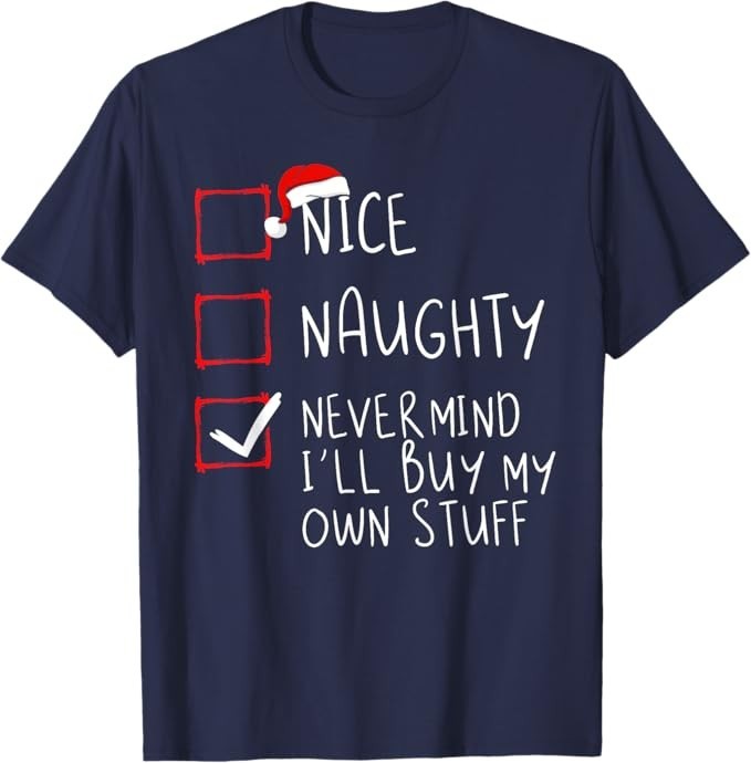 Nice Naughty Never Mind I'll Buy My Own Stuff Christmas List T-Shirt Designed and Printed in USA Product Features: • Classic Look and Feel: This ultra cotton tee offer the timeless appeal of traditional cotton. The high-quality print enhances its casual appearance. • Material: Made from 6.1-ounce, 100% cotton. (Note: Dark Heather variant is 50% cotton, 50% polyester.) • Durability: Features double-needle stitching on the neck, sleeves, and hem for added durability. Designed for a roomy, unisex fit. • Print Type: DTG (Direct to Garment) • Manufacturer: Gildan 5000, 5000b (Made in USA) Shipping Information: • Handling Time: With POD(Print-On-Demand) product model, we typically require about 3 business-days handling time before shipping. In most cases, our handling time’s , rang e from 1-2 business days. • Delivery Time: • USA: Approximately 2 -6 business days • Canada: Approximately 6-10 business days (We currently don’t offer international Shipping) • Worldwide: Approximately 15-25 business days (We Currently don’t offer international Shipping) • Shipping Carriers: USPS and DHL • Note: Business days exclude weekends and holidays. Return & Exchange Policy: • Quality Guarantee: We stand behind the quality of our products and workmanship . Any defects or errors on our part must result in a refund/ replacement at no charge. • Conditions for Returns: Returns are generally not accepted for user errors such as incorrect selection of sizes, designs, or colors. Returns /Replacements are acceptable for damages such as poor printing results, incorrect size or design caused by us. • Note: Please reach out to us if there are any questions or issue s with your item, we’ll do our best to resolve any issue you might have. Note: • We’re glad to have your support! If you have a moment, y our honest feedback is very valuable to us. Thank you!