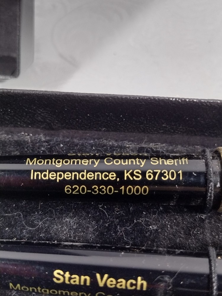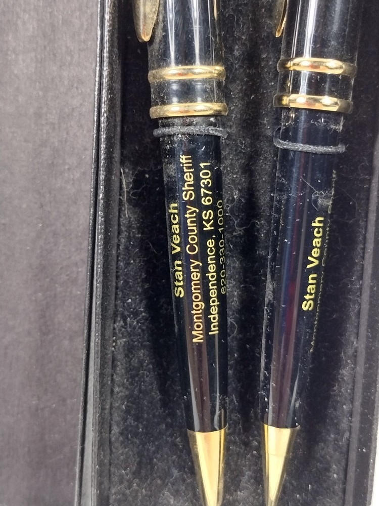New pen and pencil set in the Box written on them is Dan Veach Montgomery county sheriff Independence Kansas XXXXX phone number 620-XXX XXXX. this guy either is it currently the sheriff or running for sheriff either way it is advertising for the sheriff's department. And they work these pins his pin and pencil works