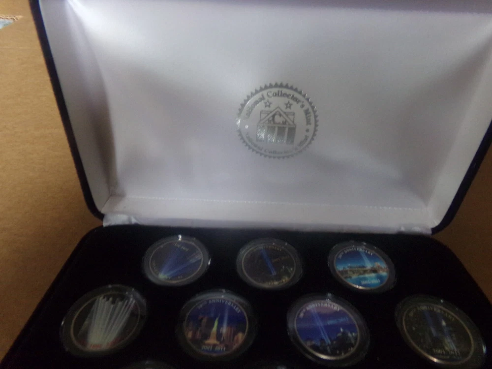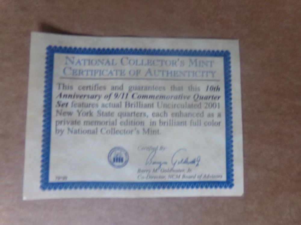 This is a BU colorized set of 2001 Washington quarters. These are a 10 year anniversary set of 9/11. These were issued by the National Collector's mint. It comes with the Certificate Of Authenticity. Still in original case and box. Very nice set. If I can ship any cheaper, I will issue a partial refund. I do combine shipping. I will have many more items to post, so watch for me.