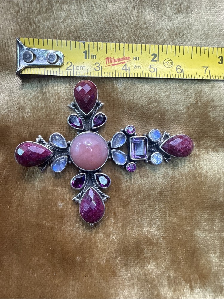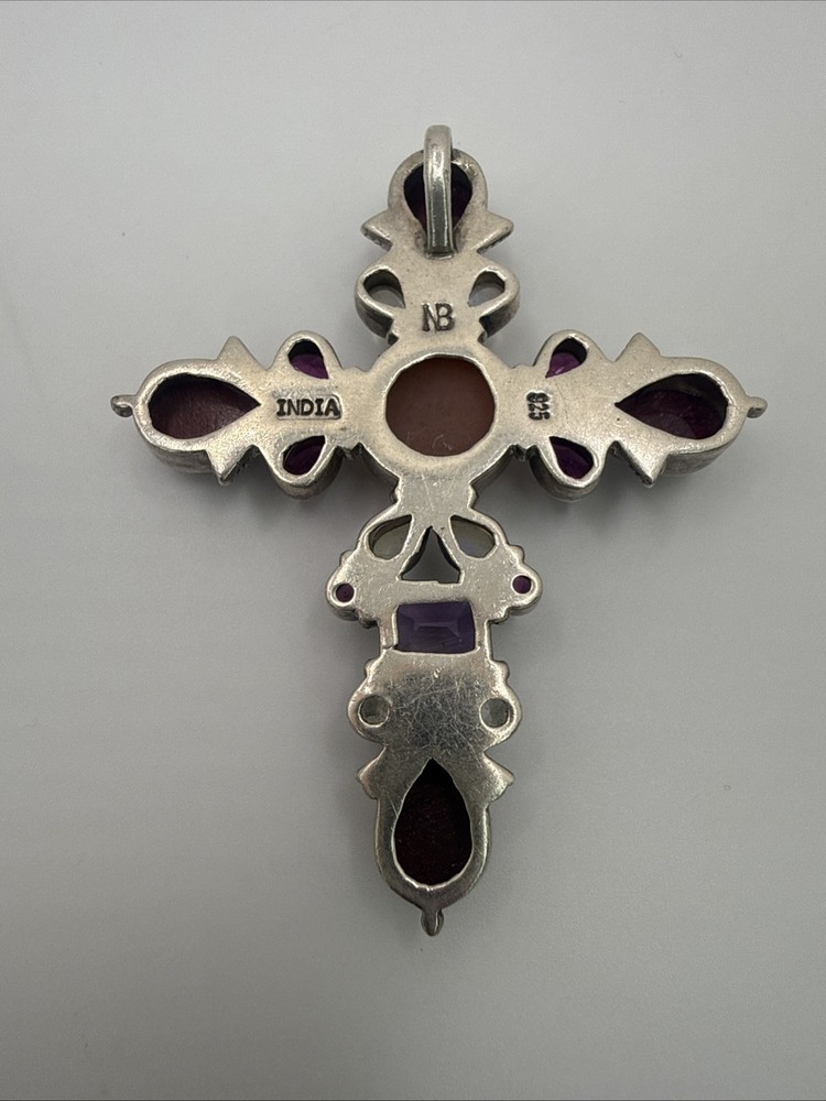 ✨ Nicky Butler Gemstone Cross Pendant & Necklace – Sterling Silver (925) ✨ Beautiful and eye-catching Nicky Butler cross pendant featuring a stunning mix of genuine gemstones set in solid sterling silver. This piece has a bold, dimensional design with rich color and classic artisan detailing. Details: • Brand: Nicky Butler • Metal: Solid Sterling Silver (marked 925) • Country of Origin: India (stamped) • Gemstones: Mixed natural stones including pink center cabochon, ruby-tone faceted stones, moonstone, and purple stones (likely amethyst or garnet) • Pendant Style: Ornate gemstone cross • Includes: Pendant + necklace chain (as shown) • Finish: Oxidized sterling for depth and contrast Condition: Very good vintage condition. Stones are secure. Light surface wear consistent with age and normal use. Please review all photos for exact condition and details. This is a beautiful statement piece — perfect for collectors of Nicky Butler jewelry, gemstone lovers, or anyone who loves bold, spiritual-inspired designs. 💖✝️ ✨ Offers are welcome — feel free to send one! 💌📬